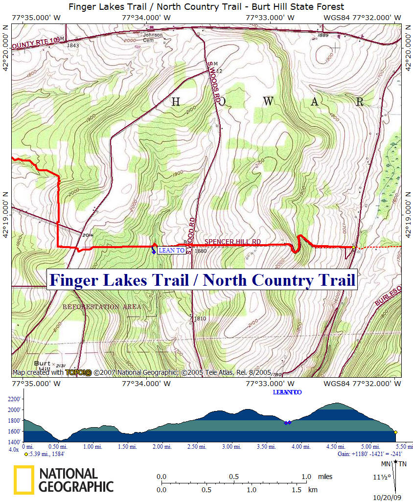 This 5.4 mile section of the North Country Trail features Burt Hill State Forest in Steuben County. The NCT coincides with the white blazed Finger Lakes Trail during this stretch of trail.