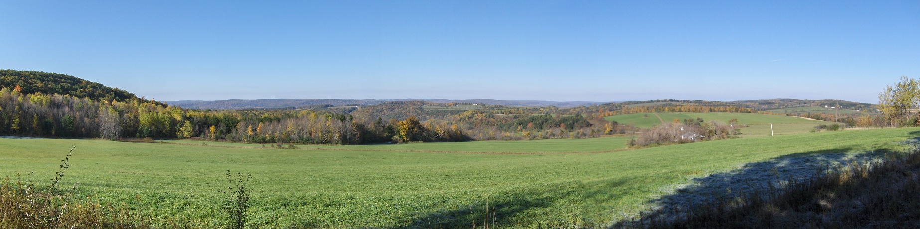 After awhile the trail comes back toward Cunningham Creek and you'll be crossing a few deep gullies before finally ascending, following near a field edge. There are views through the trees, but don't worry the best views are ahead of you as you cross Windfall Road (2.95 miles of hiking) and the trail follows along a field. The views here are spectacular (see panorama above). The trail leaves the field and ascends toward Burt Hill Road.