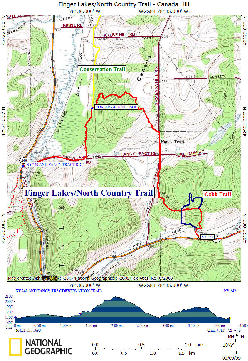 This 4.2 mile section of the North Country Trail runs from the corner of NY 240 and Fancy Tract Road which is northeast of Ellicottville to NY 242, west of Boyce Hill State Forest. This section of the trail is partly on private property as well as property donated to the FLTC and travels along the side of Canada Hill. This stretch of the NCT coincides with the white blazed Finger Lakes Trail.
