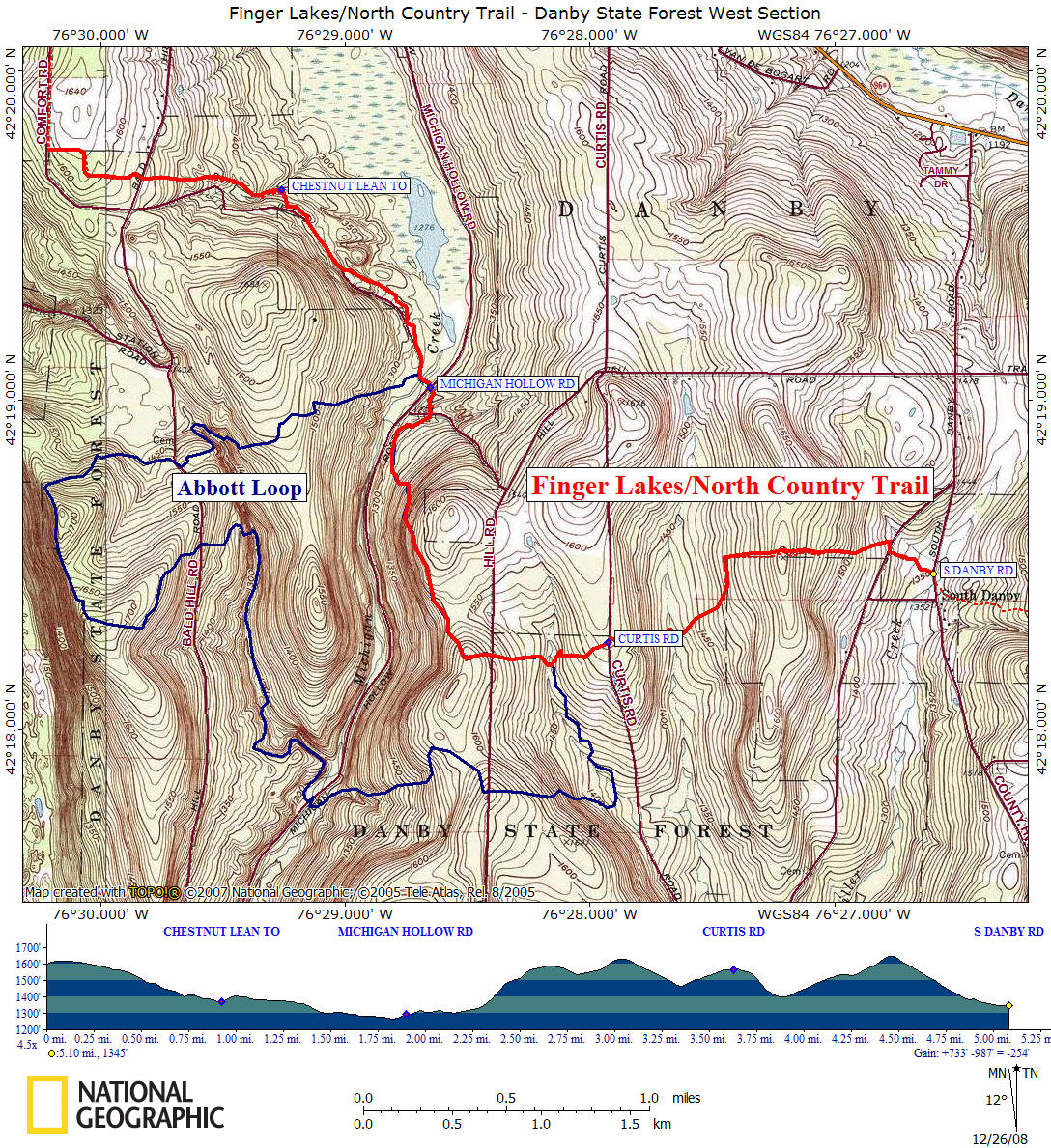 5.1 1345 feet Reach South Danby Road and end of this section. DEC parking lot to the north. GPS N42 18.492 W76 26.596 For a continuation see the Eastern Section of FLT/NCT on Danby State Forest.