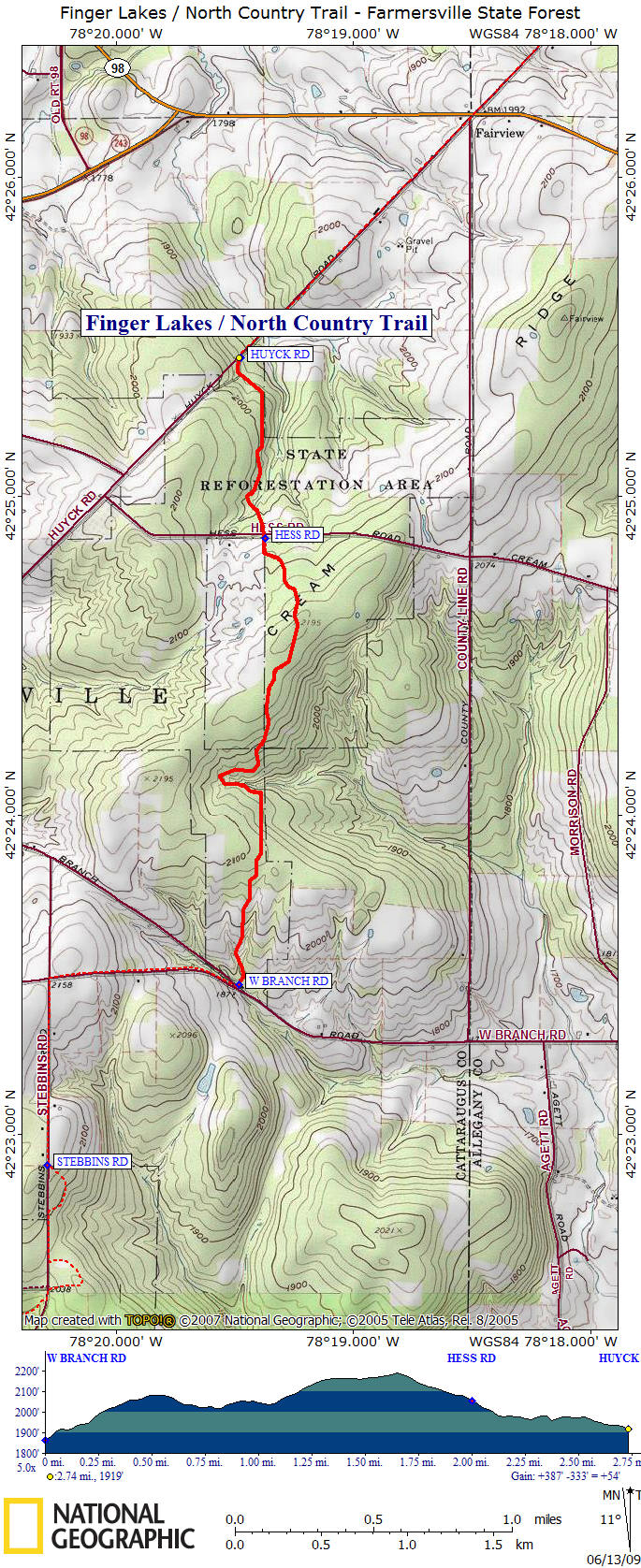 2.75 1919 ft Reach Huyck Road. Some parking. GPS N42 25.431 W78 19.490 End of this section. See Swift Hill State Forest for the next section of the NCT.