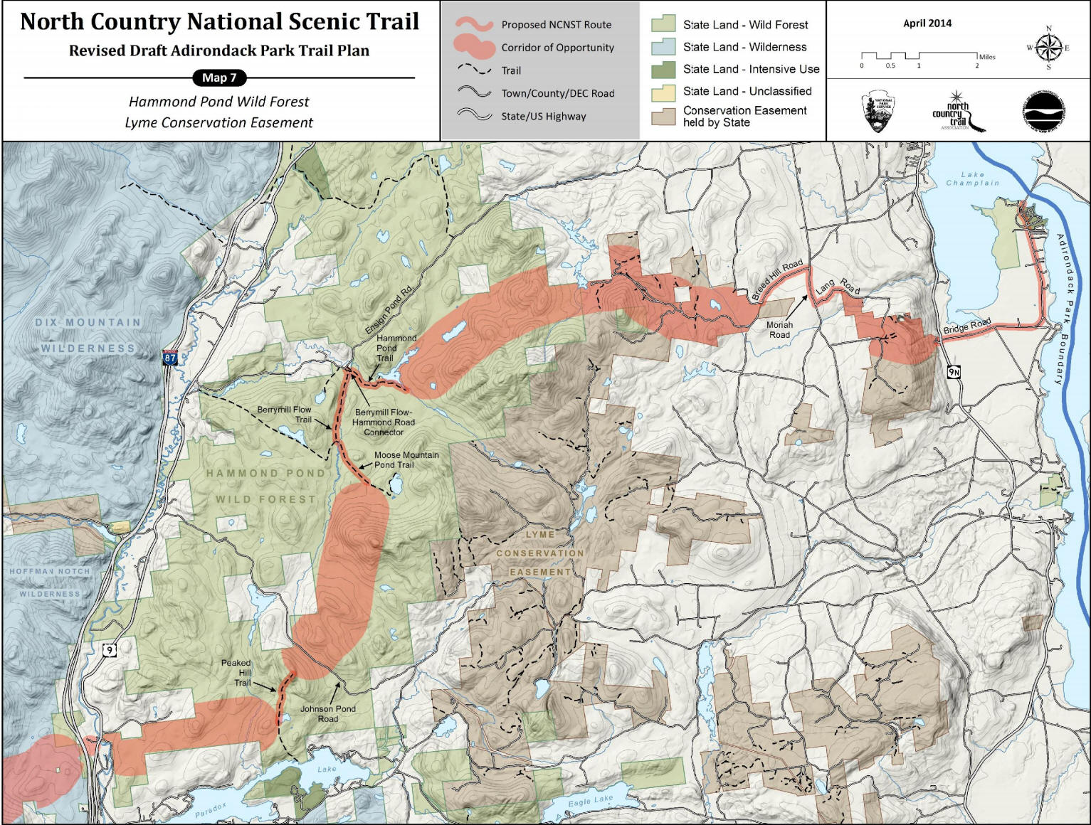 The Hammond Pond Wild Forest is located in the northeastern Adirondacks and the Lake Champlain Basin of Essex County. There are approximately 40,036 acres in this wild forest, which is situated in the Towns of Crown Point, Elizabethtown, Moriah, North Hudson, Schroon, Ticonderoga, and Westport. The DEC recently released a 2014 updated proposed route of the future NCT that differs somewhat from the 2007 original plan.