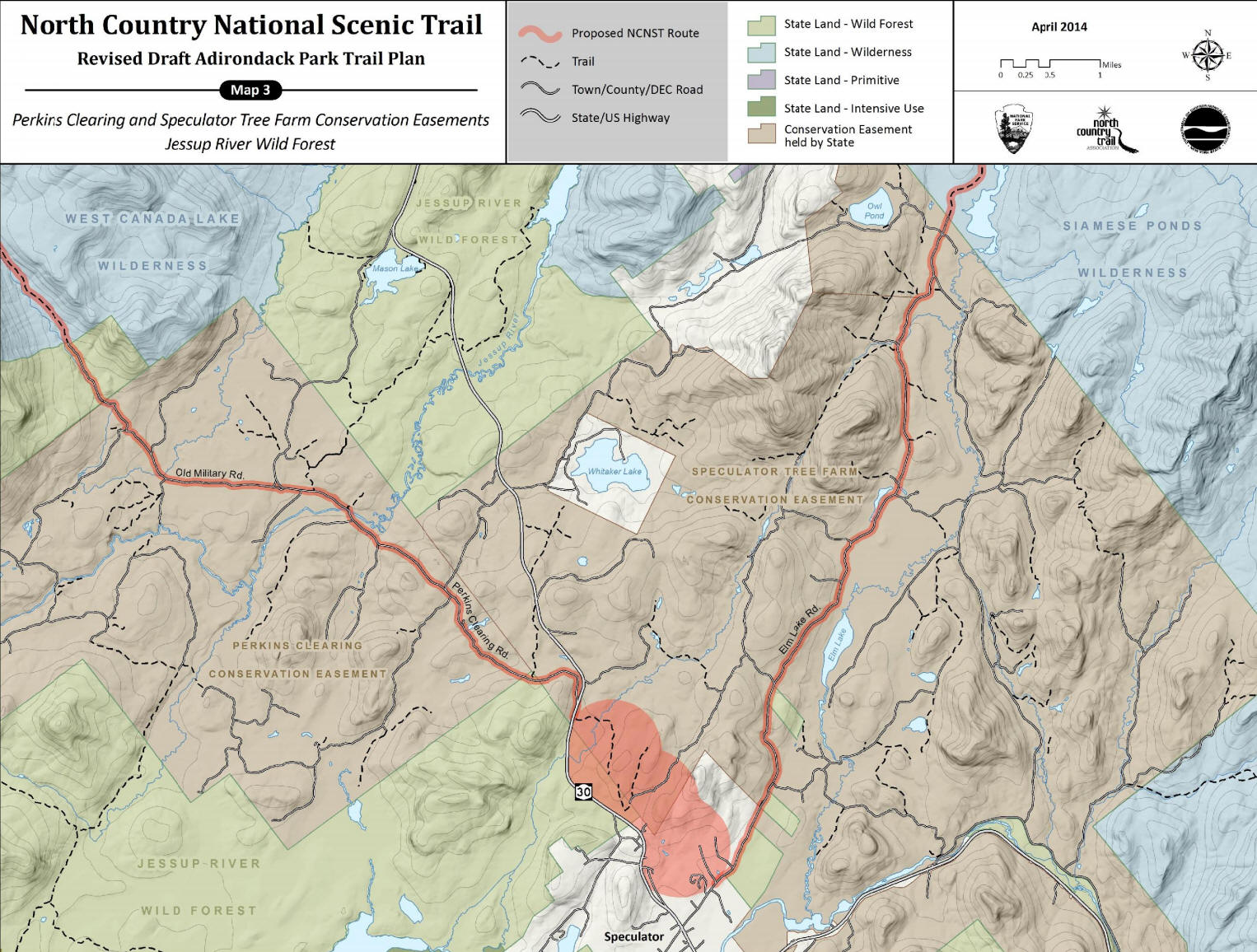 The new 2014 DEC plan simply has the North Country Trail following seasonal dirt Old Military Road and Perkins Clearing Road to NY 30. A new trail will be constructed to keep the NCT off busy NY 30 near Whiskey Brook, which will be on a combination of state land and conservation easement lands. The new trail will bring the NCT to Elm Lake Road. The NCT will follow Elm Lake Road all the way to it's end, where the NCT will enter Siamese Ponds Wilderness. This new plan will bring the North Country Trail close to Speculator, creating a perfect resupply destination for thru-hikers.