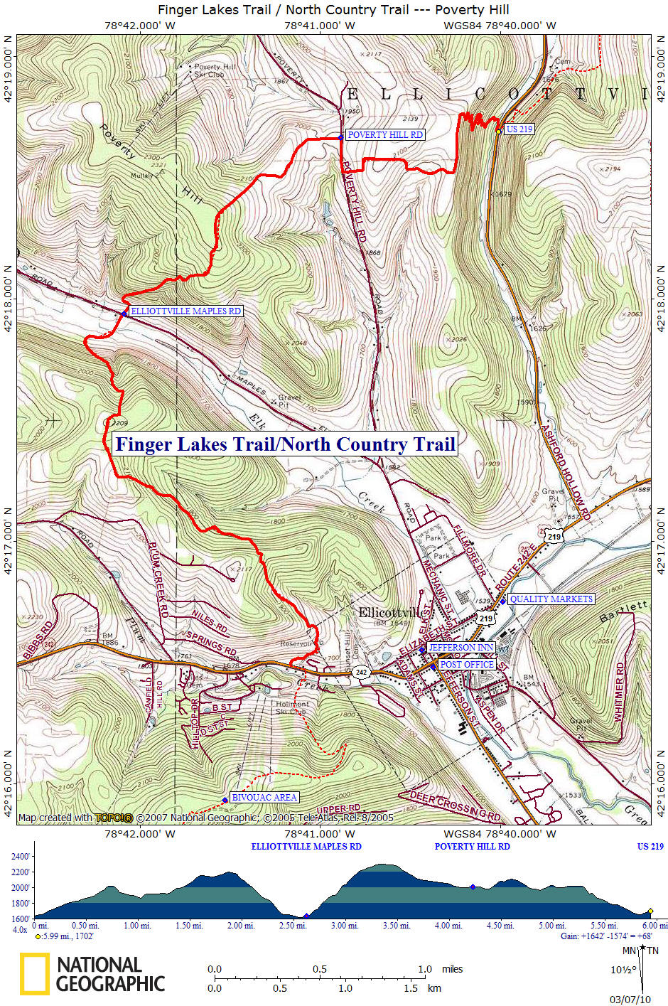 2.65 1633 ft Cross Ellicottville Maples Rd. Begin steep ascent. Trail is closed for hunting from here to Poverty Hill Rd from Oct. 1 - Feb. 28 and Apr. 15 - May 31. Please stay off the trail during these dates.