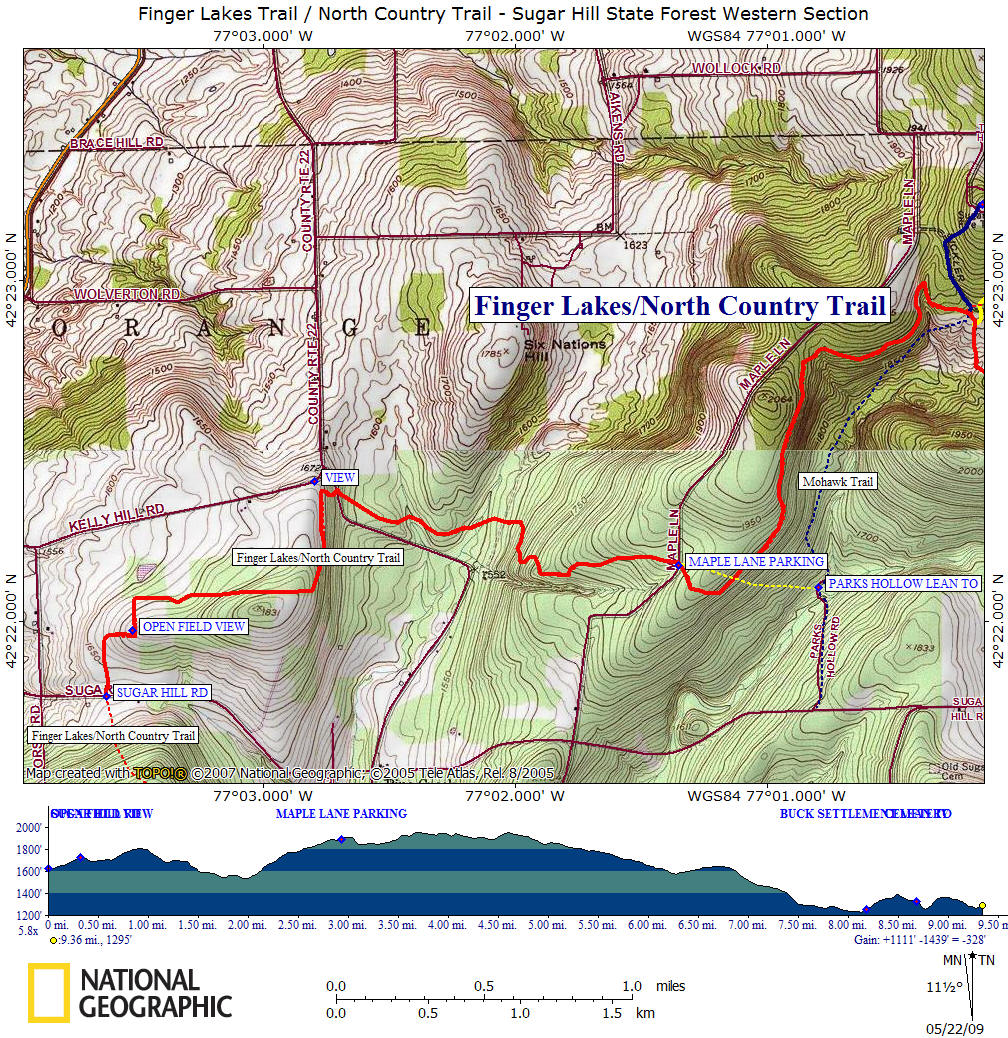 4.8 1916 feet Cross Mohawk Trail. By turning left on Mohawk trail leads 0.4 mile to Sugar Hill Fire Tower. Camping area, water and flushable toilets are available there. Finger Lakes/North Country Trail continues straight.
