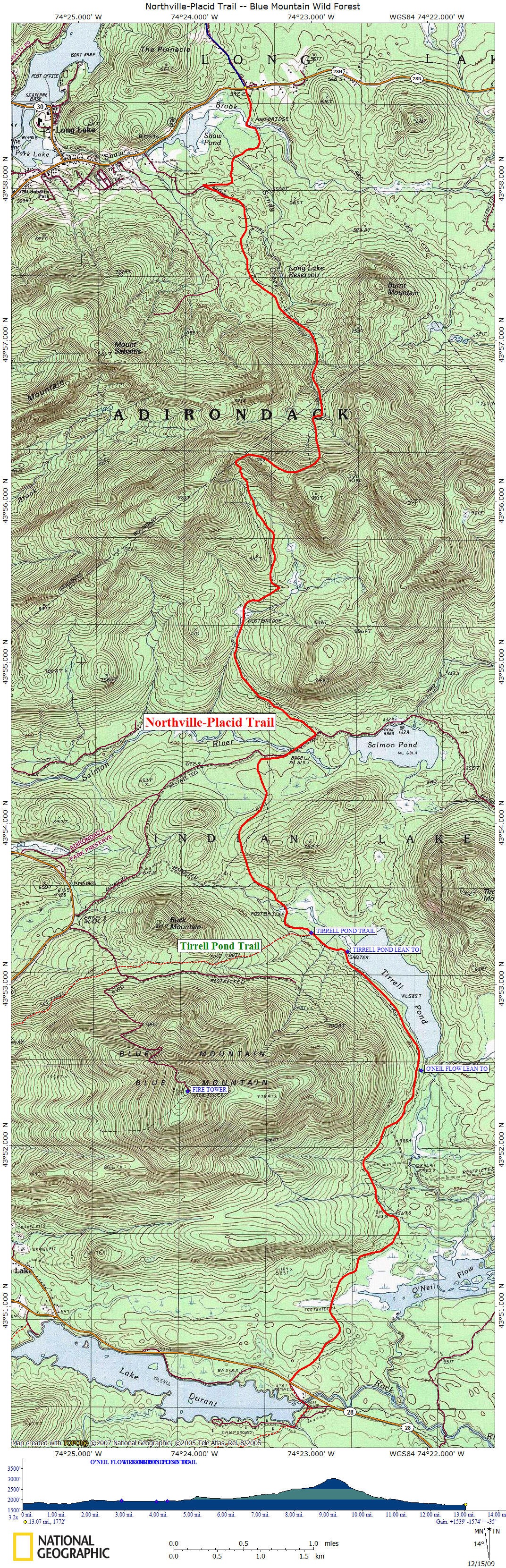 Mile Elevation Description (NY 28 to NY 28N) 0.0 1804 ft NY 28. Head north on the well worn & marked trail. The hamlet of Blue Mtn Lake is four miles to the west.