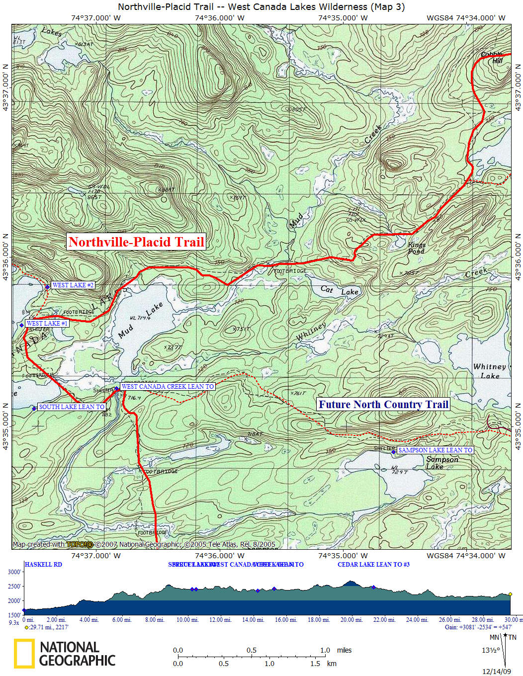 18.5 2399 feet Caretakers Clearing. Trail register. Northville-Placid Trail turns sharply right here. West Lake Lean To #2 is via left trail.