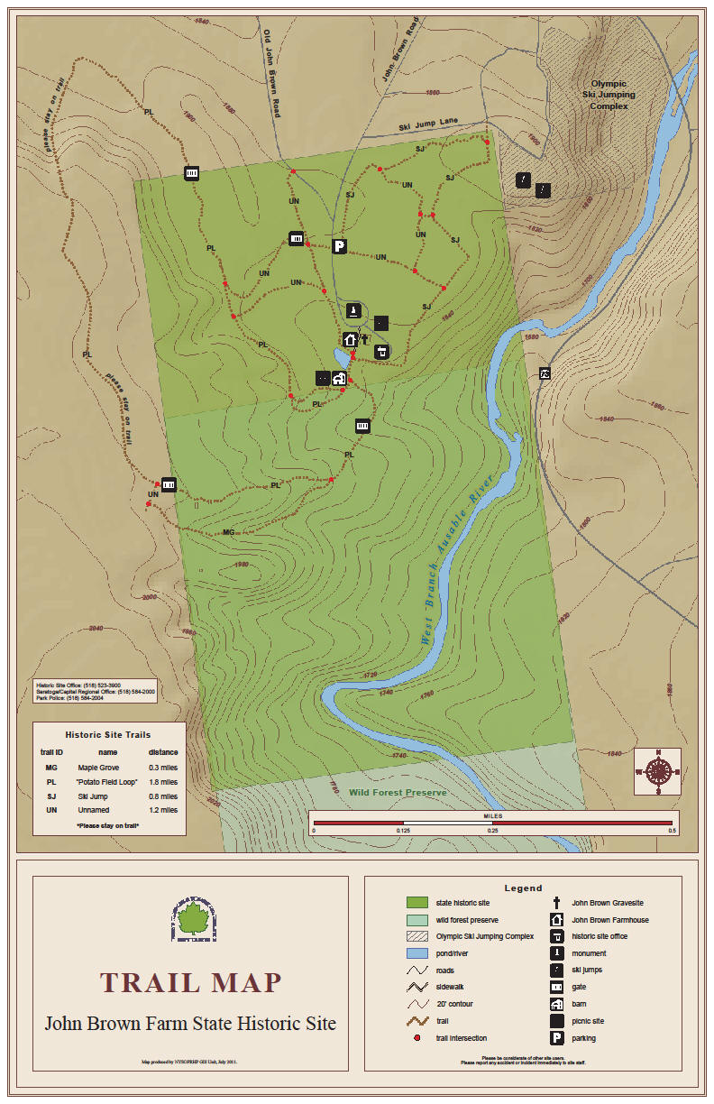You can find more info on John Brown Farm State Historic Site from the NY State Parks website. There is a great trail map also from the NYS Parks. We have a copy of the trail map below. The grounds are open all year. The tours of the cabin are open May to October from 10am-5pm, except on Tuesday (CLOSED). There are picnic tables and nice restrooms (in the barn), as well as a privy. Look below for a few pics, the trail map, a map of the area and a video.