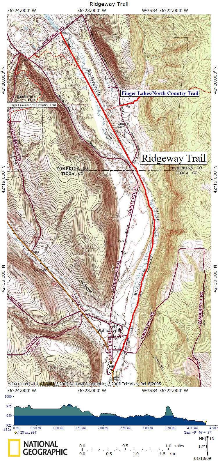 The Ridgeway Trail is a rail trail that follows the old Delaware & Lackawanna Railroad which was abandoned in 1956 as well as the old Lehigh Valley Railroad. The trail follows along scenic Willseyville Creek and the Finger Lakes Trail / North Country Trail follows the old railroad bed for a short time.