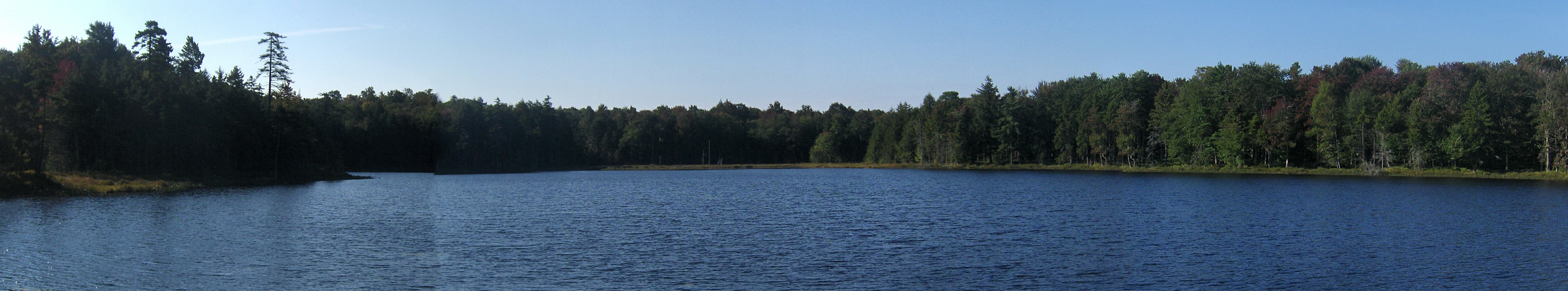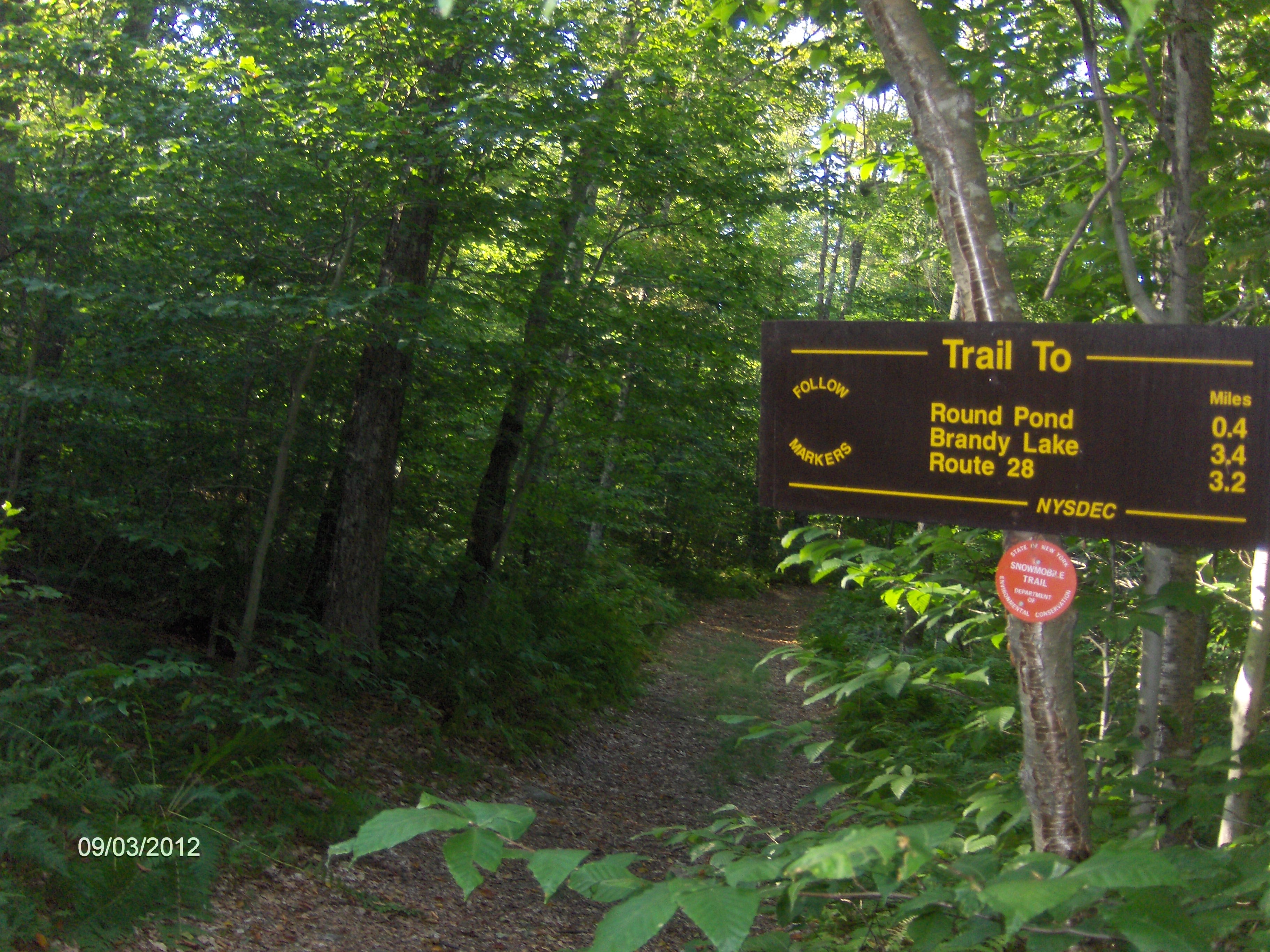 There is no DEC signage at the trailhead and parking is a few spots for vehicles along the shoulder of the road. There is a DEC sign about 50 feet on the trail that states the mileage for the trail. The DEC sign states that the distance to Round Pond is 0.4 miles, maps and guides have the distance at 0.3 miles, we GPS'd the hike at 0.34 miles. There is a minimal elevation change for this simple hike.From Moose River Road, follow the wide trail marked with red snowmobile trail markers into the woods. Immediately pass a DEC trail mileage sign. The sign states it's 0.4 miles to Round Pond, 3.4 miles to Brandy Lake and 3.2 miles to Route 28 (it's actually 2.7 miles to NY 28). At 0.25 miles reach an unmarked junction. The trail to the right leads a short distance to Round Pond. You should see the pond as you look down the trail. The trail on the left continues another 1.5 miles to the junction of the Brandy Lake Trail.