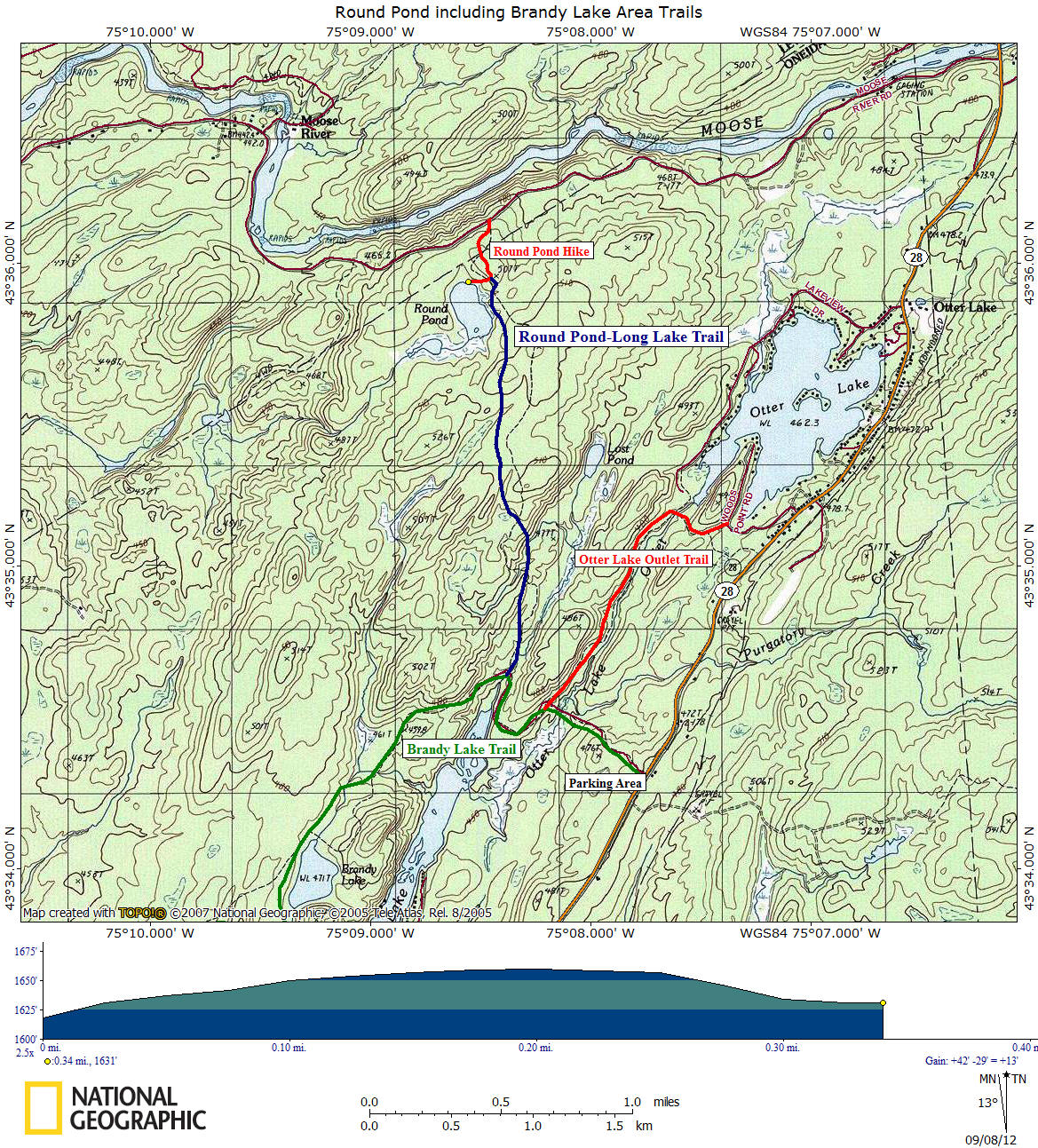 Directions: To reach the trailhead, from NY 28 turn on Moose River Road (before the Moose River bridge heading to Old Forge, after the bridge if heading from Old Forge. Drive 2.1 miles on Moose River Road and the trail is on the left near the crest of a small hill. The GPS coordinates are N43 36.147 W75 08.463 for those who have a GPS devise in their vehicle.
