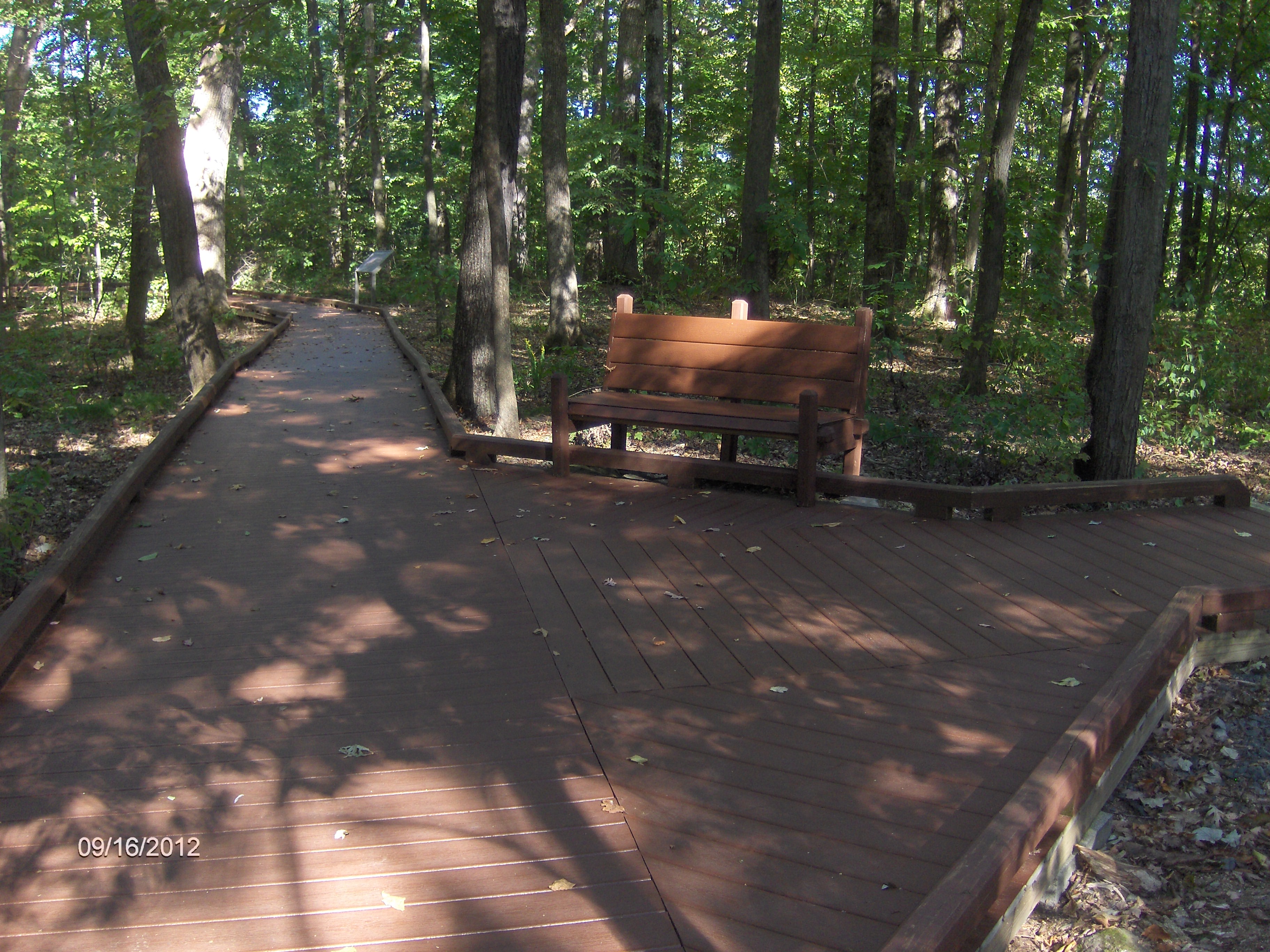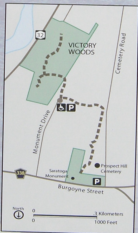 Two options are available for visiting Victory Woods. You can park at Saratoga Monument and follow the foot path through the cemetery to the Victory Woods trail head for a 1.6 mile round trip hike, or drive to the end of Monument Drive (just downhill / east of Saratoga Monument) and park in the cul-de-sac there. There is an accessible boardwalk and pathway that runs about 1/2 mile through Victory Woods, along with interpretive signs that help tell the story of the last stand for Burgoyne's surrounded army. There is a picnic table on the boardwalk at the end of an arm of the trail. You'll also find a few benches along the way.