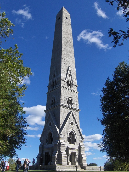 Saratoga Monument features both Gothic and Egyptian style elements. The monument stands 154.5 feet tall and has 188 steps within the monument that connect five levels with a viewing platform at the top. The cornerstone was laid on October 17, 1877. Within the cornerstone contains a US flag, a 1777 silver coin bearing the image of King George III, an 1877 US silver half dollar, a memorial to the opening of the NY & Canada Railway, Bennington Battlefield Monument documents and 21 newspapers. The initial landscaping was completed in October 1897 with an official dedication on October 17, 1912. The views are spectacular from within the monument.