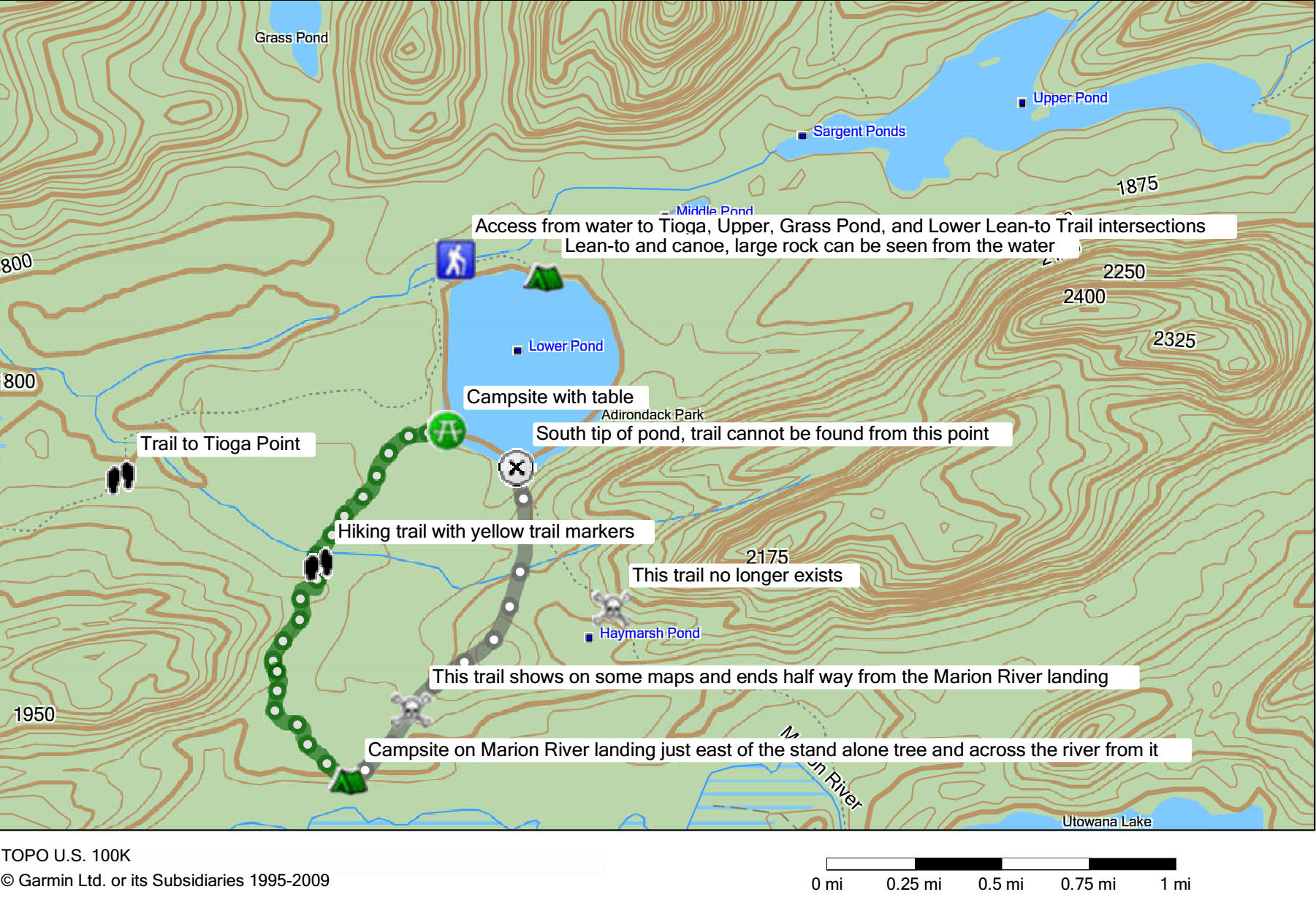 A herd path circles around most of the pond, as well as many informal campsites. There is also a trail that starts on the southern shore of the pond that leads to the Marion River. We have included a map below that shows the new trail from the Marion River courtesy of a fellow hiker/kayaker, as well as a picture. The new trail/landing is east of the tree on the opposite shore (see picture below). The old trail that is on our map no longer exists. There is also a fish barrier dam located near the Tioga Point Trail junction. You'll hear the sounds of a waterfall as you approach the unmarked side trail. Look below for directions, a trail map and video of this great hiking adventure.