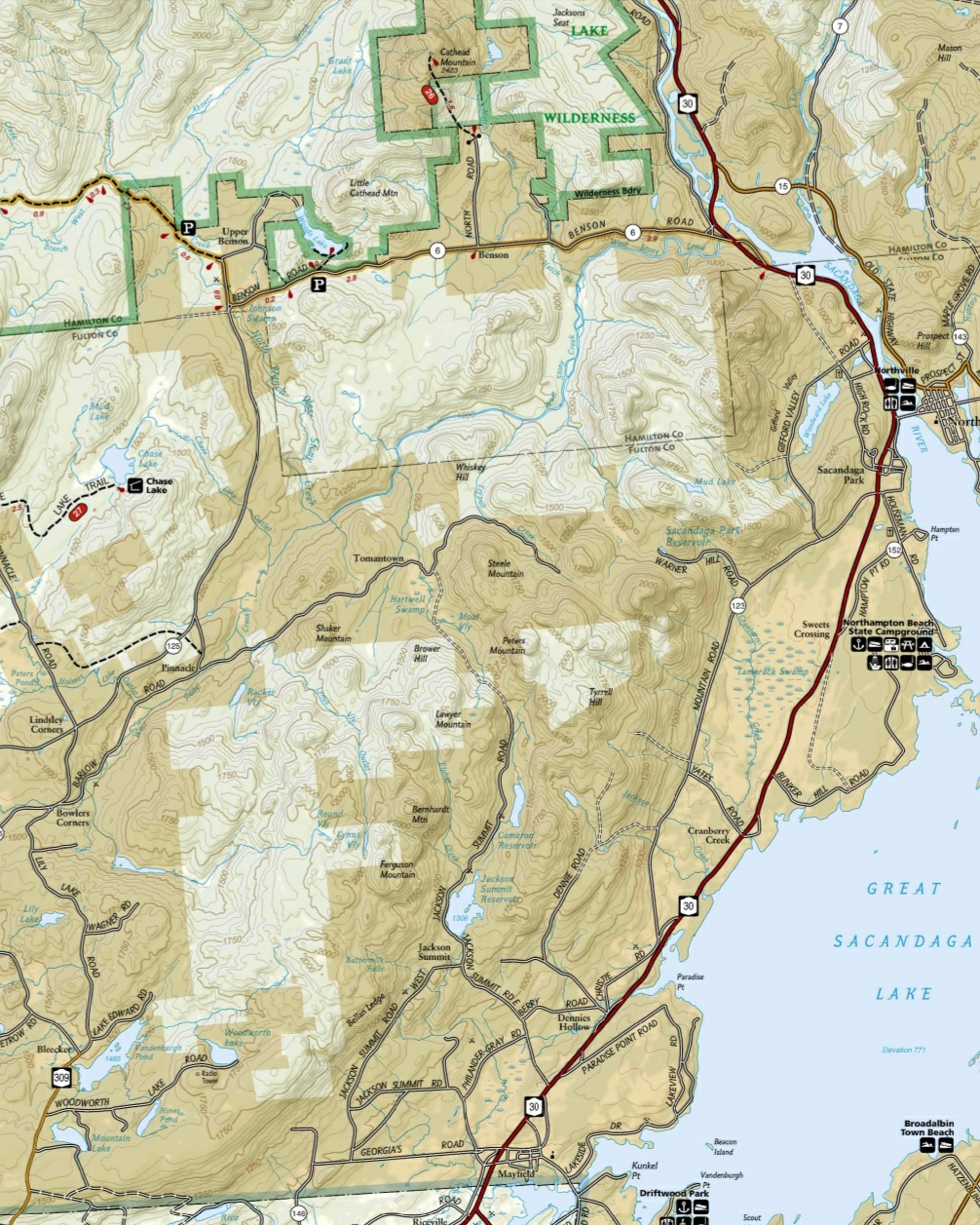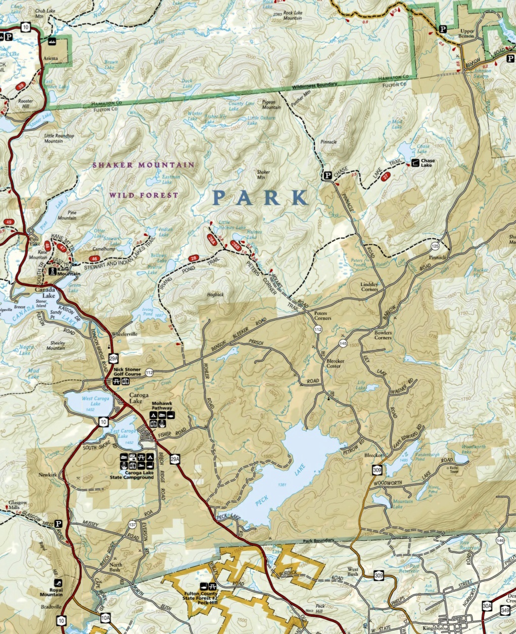 The 40,500 acre Shaker Mountain Wild Forest is located in southern Adirondack Park. This wild forest is easily accessible from Albany, Schenectady, Amsterdam, Gloversville and Johnstown. Popular state campgrounds are located at Caroga Lake and Northampton Beach. NY 10 is the western boundary of the wild forest, NY 30 to the east, the Adirondack Park blue line to the south and Silver Lake Wilderness is to the north.