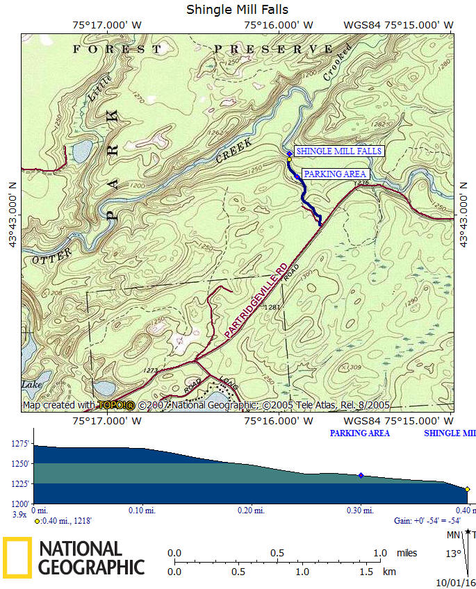 The GPS coordinates of the small parking area that is at the end of the narrow dirt road is N43.160 W75 15.892. The dirt road is located about 2.6 miles on the left along Patridgeville Road as you drive away from Brantingham. The day we visited the waterfall in late September 2016, the water levels were extremely lower than normal.
