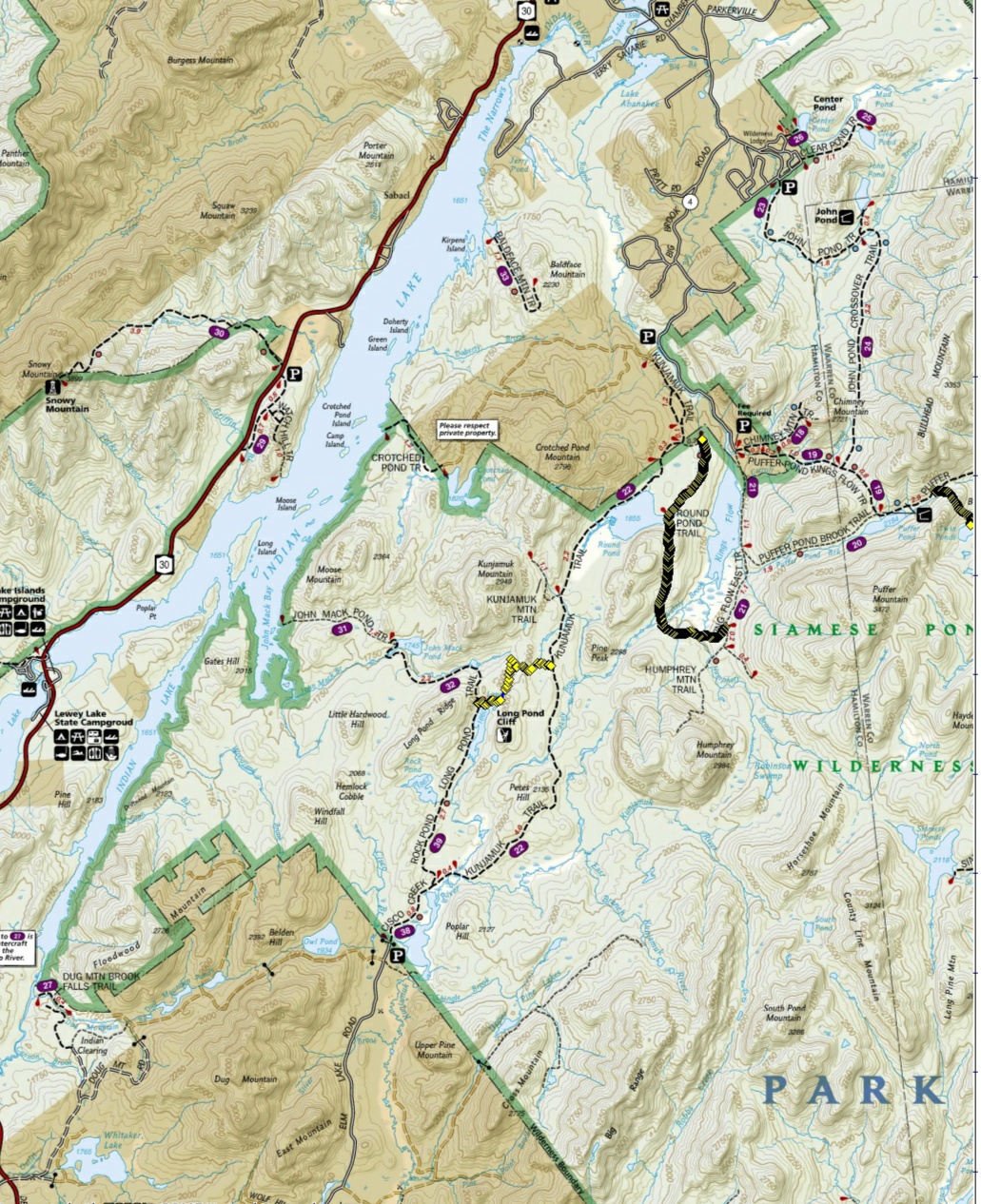 Kunjamuk Road Trail - (6.4 miles) the majority of this trail formed the “Old Kunjamuk Road.” This section of trail begins at its intersection with the Long Pond Trail and travels north east to its intersection with the State Land boundary north east of Round Pond. The last 1.2 miles of the Old Kunjamuk Road connect the trail from the Siamese Ponds Wilderness boundary to Big Brook Road. This section of trail crosses private property owned by International Paper Company, Inc. and state land in the Jessup River Wild Forest.