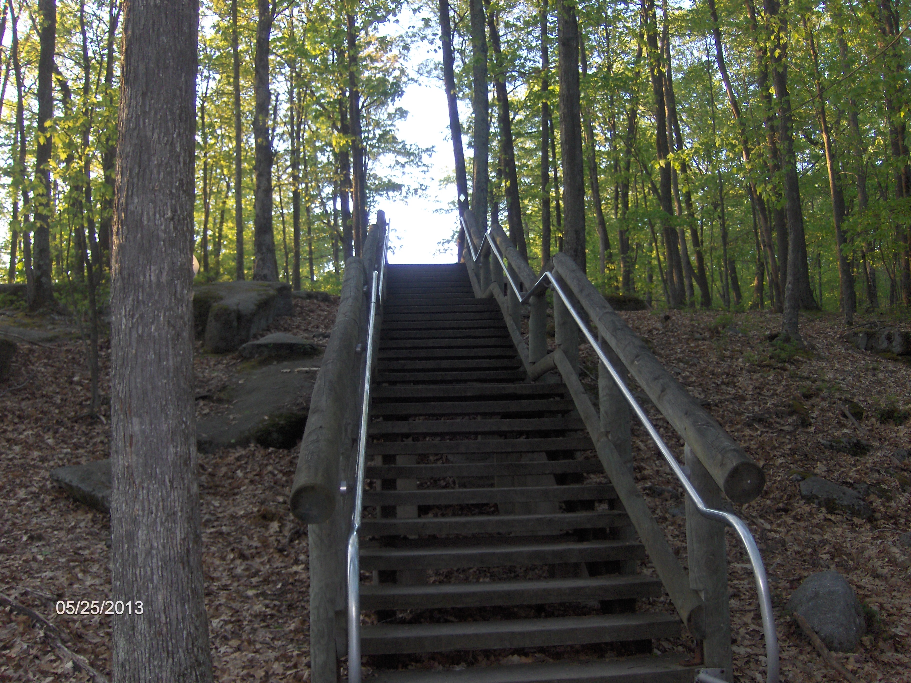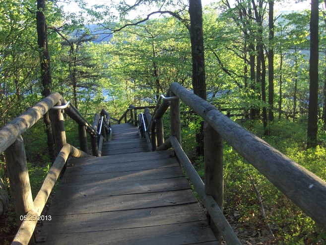 A short trail down steep stairs leads to a scenic view of Kinzua Bay, which extends southwest from the main body of the Allegheny Reservoir. There is a 200 foot elevation drop from the parking area, down the stairs to the stone overlook. There is a picnic area located near the parking area. The parking area is on Forest Road 454, 2.5 miles from PA 59, which is about 17 miles east of Warren, PA and 23 miles west of Bradford, PA. The GPS coordinates for the turn off PA 59 onto FR 454 are N41 51.572 W78 54.697 for those who have a GPS devise.
