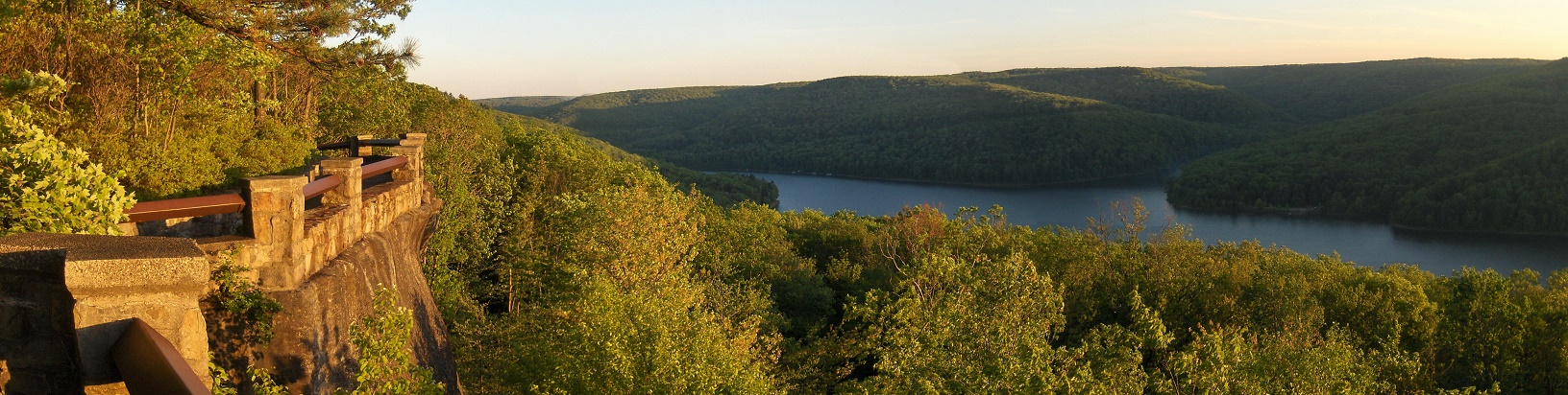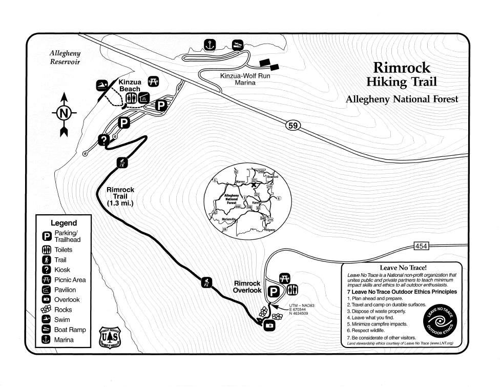 You can find more information on this popular destination in Allegheny National Forest from the USDA Forest Service website. While it is easy to visit the overlook from FR 454, the 1.3 mile Rim Rock Trail takes hikers from Kinzua Beach, steeply up to the overlook for a 2.6 mile round trip moderate hike. You can check out a pdf brochure of the trail from the USDA Forest Service website.