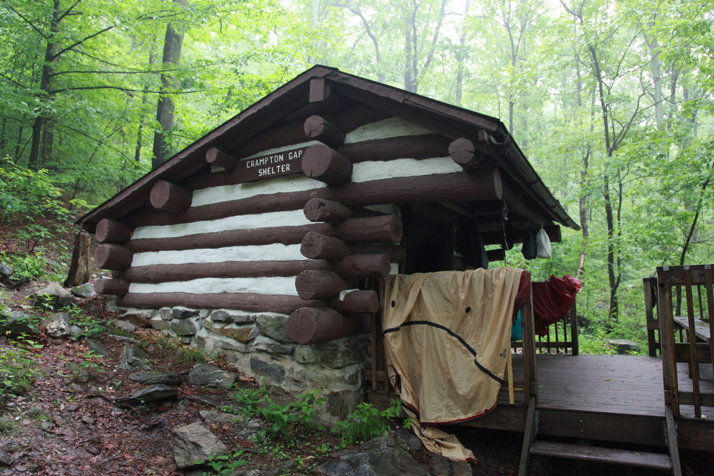 From Crampton Gap, cross Gapland Road and in 0.1 mile pass the ruins of a large stone barn. This sections begins in Gathland State Park. The AT ascends out of the gap. At 0.4 miles reach a blue blazed side trail that leads 0.3 miles to the Crampton Gap Shelter. This shelter was originally built in 1941 and sleeps six. There is a privy nearby. Water source is at times dry, north bound thru hikers will want to get water from Gathland State Park.
