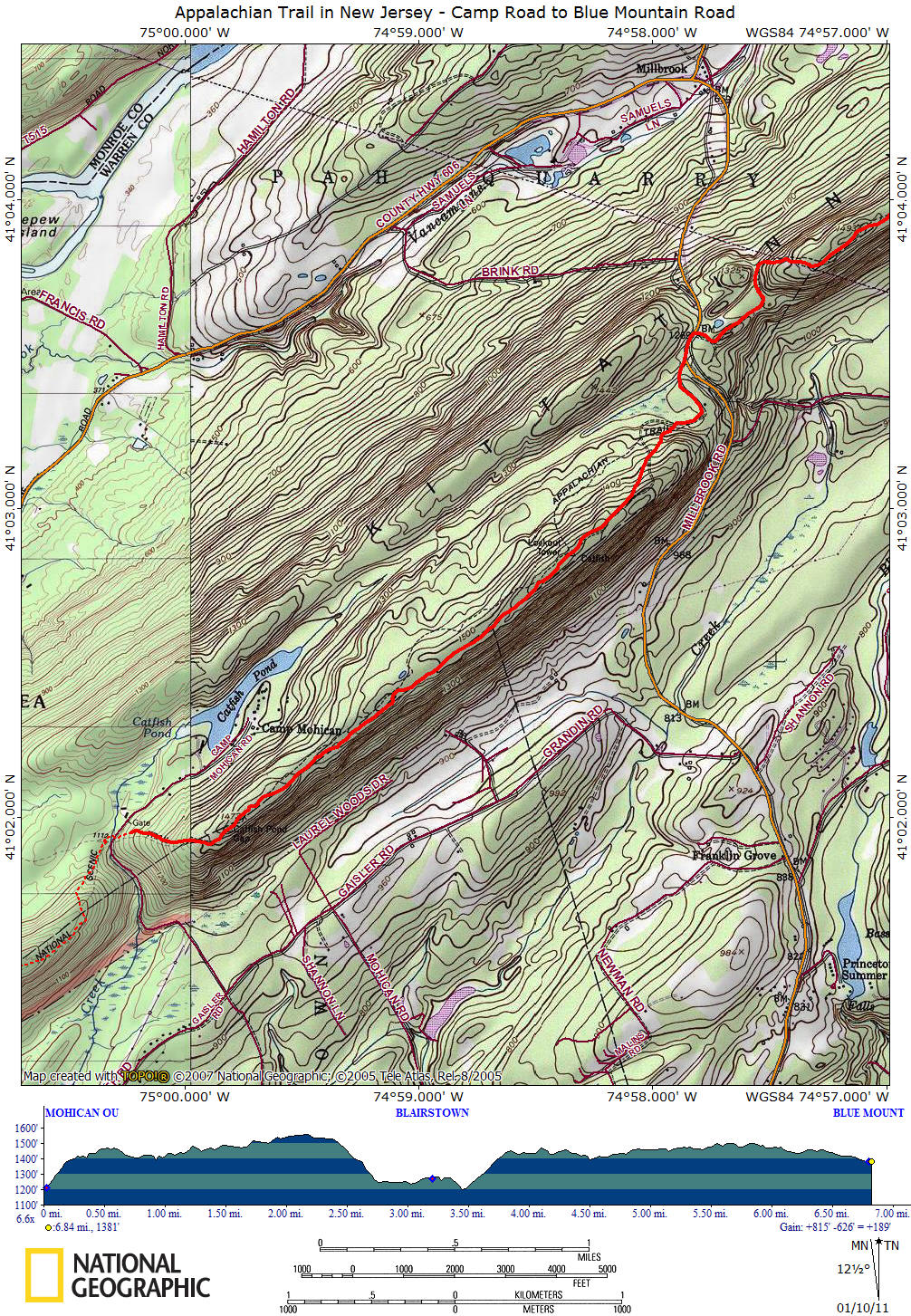 This section of the Appalachian Trail follows the ridge of Kittatinny Mountain and features the Catfish Fire Tower. There are no shelters available along the trail during this section. The Mohican Outdoor Center, run by the Appalachian Mountain Club, is located 0.3 miles from the trail crossing along Camp Road. Parking for about eight cars is also available near this trail crossing. The GPS coordinates are N41 01.990 W75 00.215 for those who have a GPS devise for their vehicle.