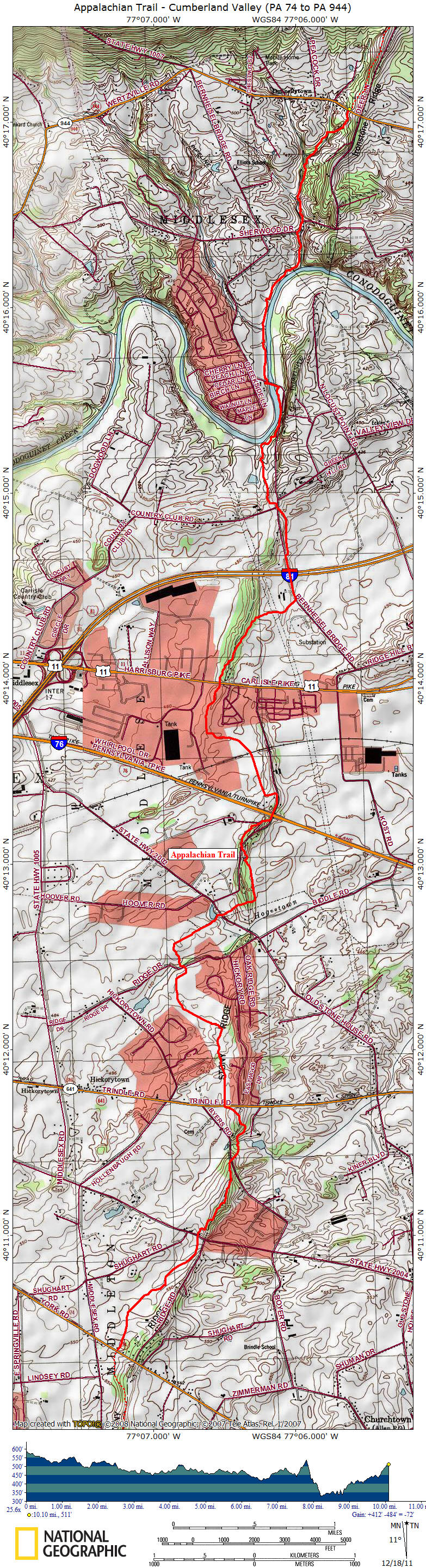 This section of trail starts off PA 74 (heading northbound) and at 1.0 miles the trail crosses Lisburn Road. The trail mostly follows field hedgerows in this area and crosses numerous roads. At 1.5 miles cross Byers Road. At 2.0 miles cross Trindle Road. At 3.1 miles cross Ridge Drive. At 3.6 miles cross Old Stonehouse Road.