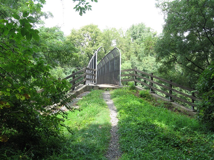 At 6.5 miles turn left onto Bernheisel Bridge Road and soon cross I-81 on the highway overpass. At 6.8 miles turn right off road and soon cross road. After a walk along a nice boardwalk next to Conodoguinet Creek, cross the creek on a pedestrian bridge attached to the Bernheisel Bridge at 8.0 miles. At end of bridge, make a U-turn, then turn left under bridge. The Scott Farm Trail Work Center is straight ahead.