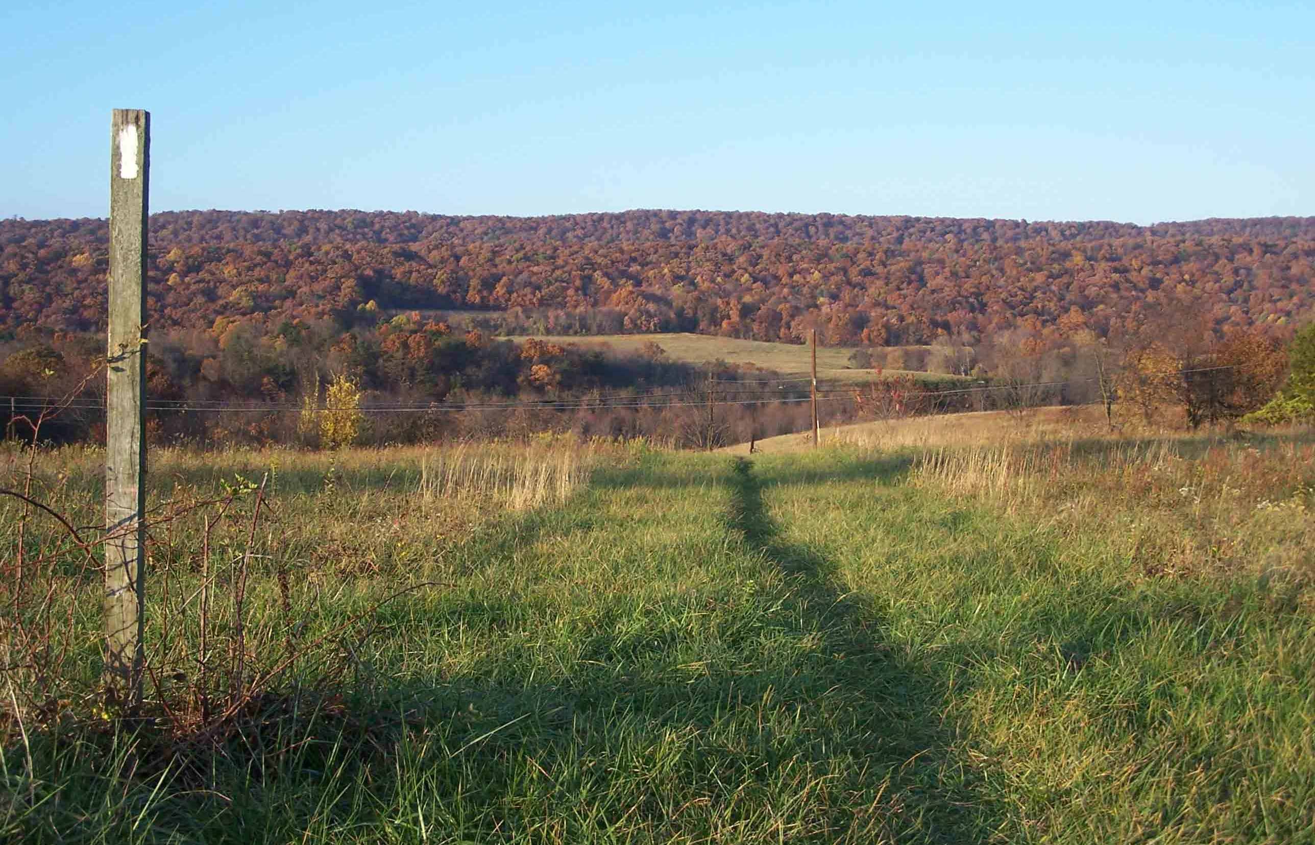 At 3.3 miles the trail turns right off the old cable clearing. At 3.7 miles the trail leaves a ravine, turns right and crosses an open field. At 3.8 miles cross Millers Gap Road. At 4.1 miles cross PA 850 and follow the blazed posts into the field. The trail crosses a wet area on a nice bridge before entering into the woods.
