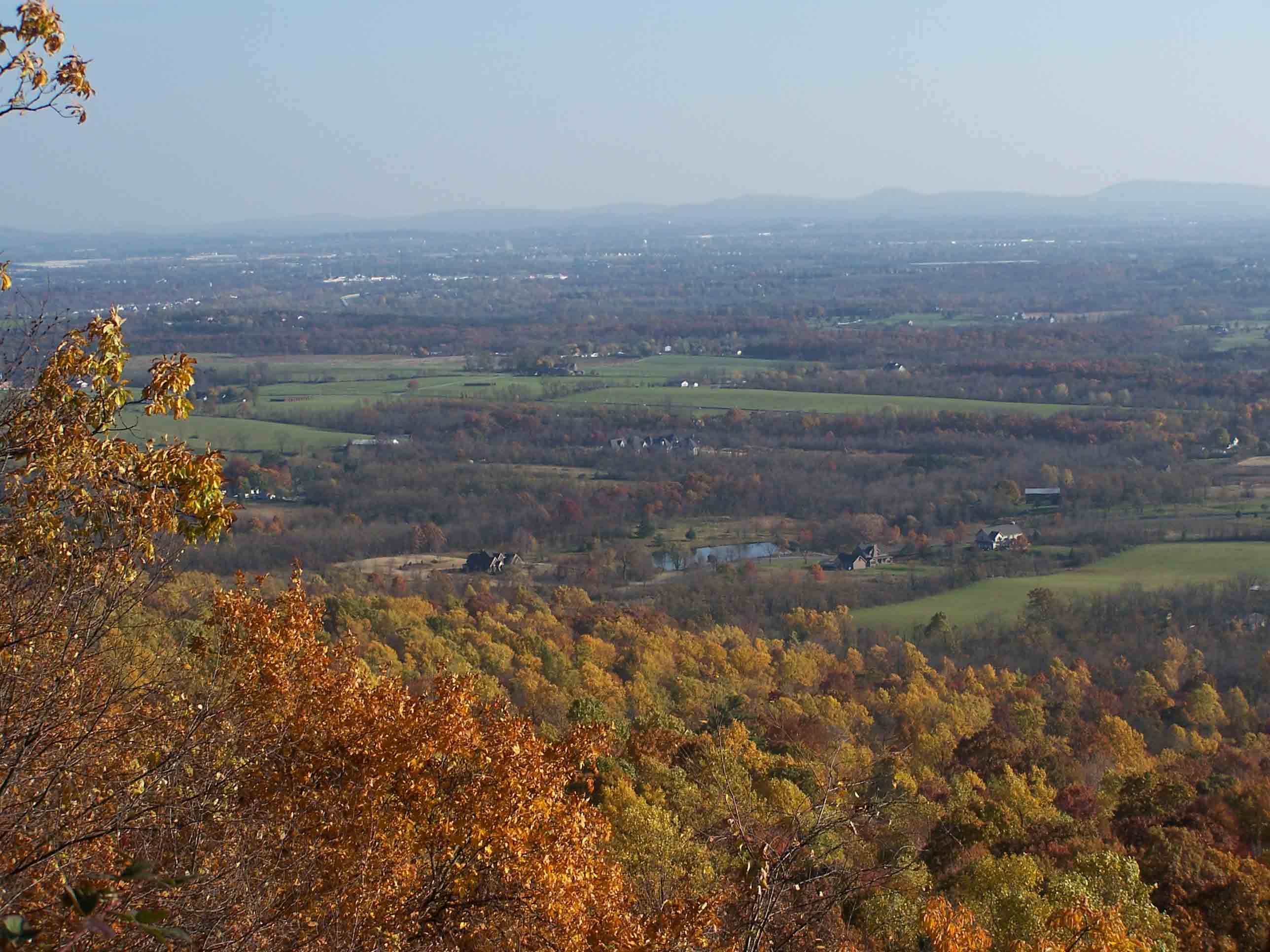 At 1.6 miles a rock outcrop just off the trail leads to a nice view of the Cumberland Valley. At 1.9 miles reach the top of this climb and a ridge top jeep road. At this point are the junctions of the blue blazed Tuscarora Trail to the west and the orange blazed Darlington Trail to the east.