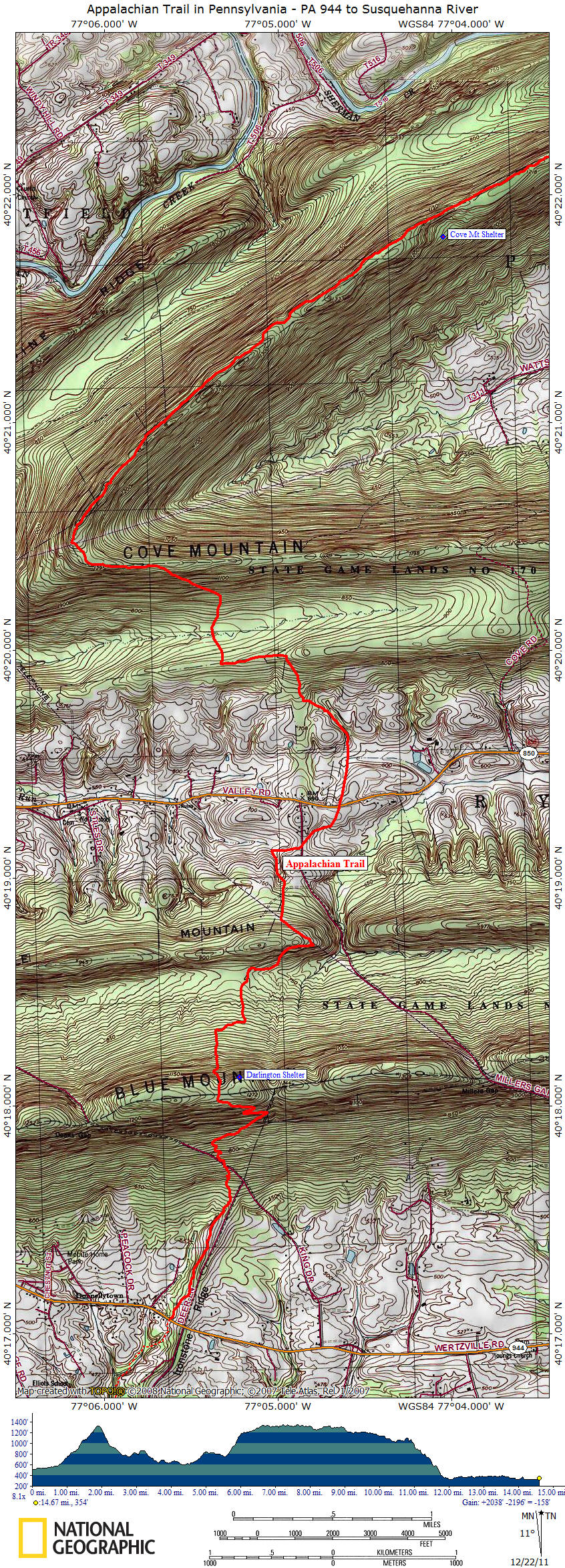 At 9.3 miles a blue blazed trail on the right leads 500 feet to the Cove Mountain Shelter. At 11.2 miles reach Hawk Rock. There are spectacular views of Duncannon, rivers and the farmland to the north. At 11.5 miles cross a rock slide. The trail descends to a paved road and at 11.9 miles turns left to follow the road. At 12.1 miles cross Sherman Creek on the road bridge.