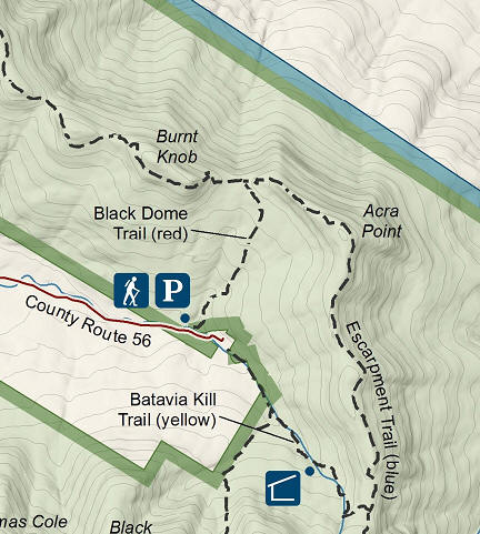 Acra Point is located along the popular Escarpment Trail. The start of this hike is from the parking area at the end of County Route 56. The GPS coordinates are N42 17.360 W74 06.963. Follow the red marked Black Dome Trail and ascend to the junction of the blue marked Escarpment Trail. Don't take the trail that follows the creek. The Long Path coincides with the Escarpment Trail. Turn right at this junction for Burnt Knob. If you turn left the trail will take you to another Catskill 67er, Burnt Knob.