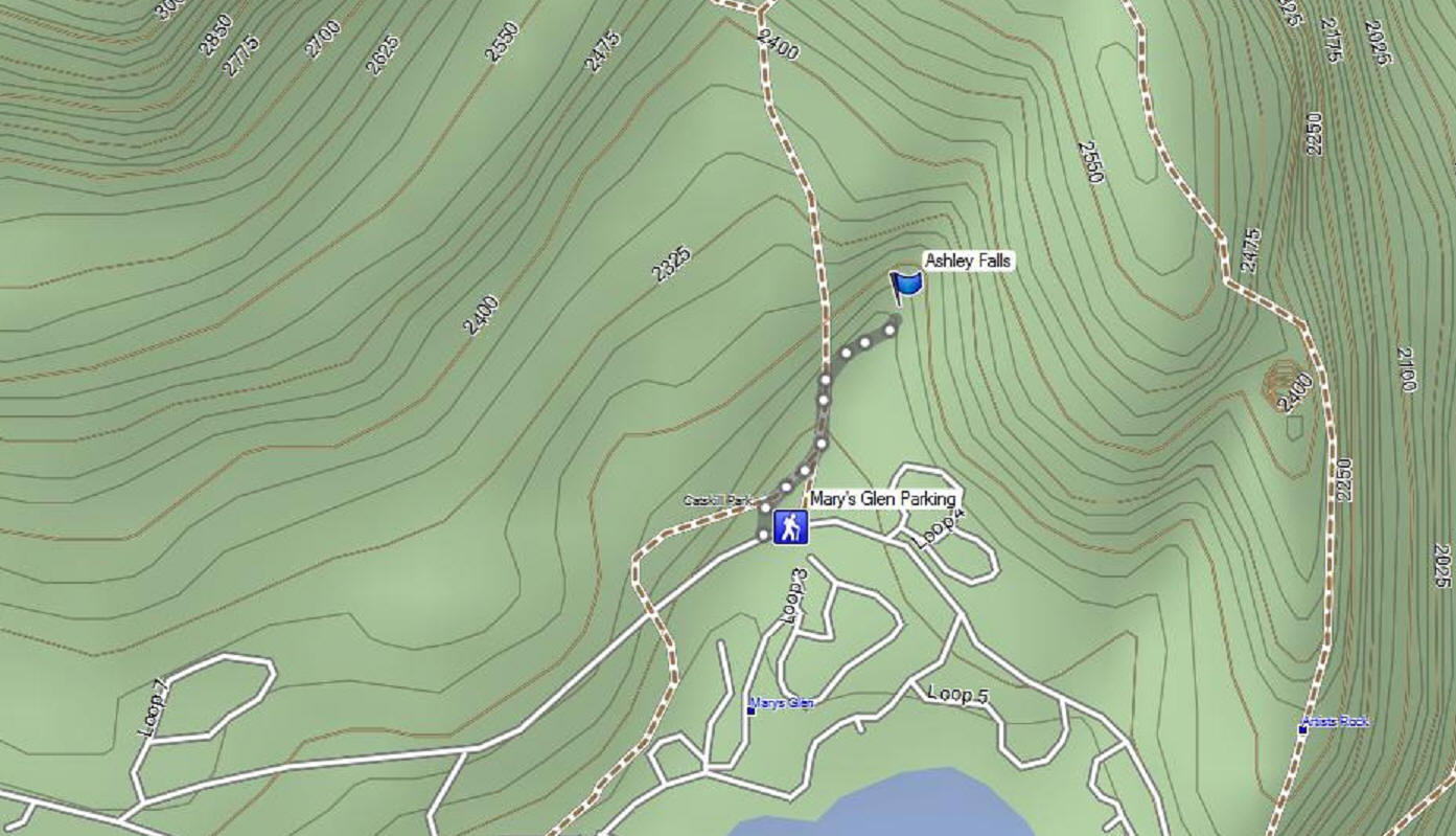 The muddy trail reaches a junction after 0.2 miles. To the right is the short trail that travels to Ashley Falls. The trail to the left is the trail that travels to North Mountain. Look below for a map and picture of the waterfall. During dry times in the summer, you may not find any water at this waterfall.