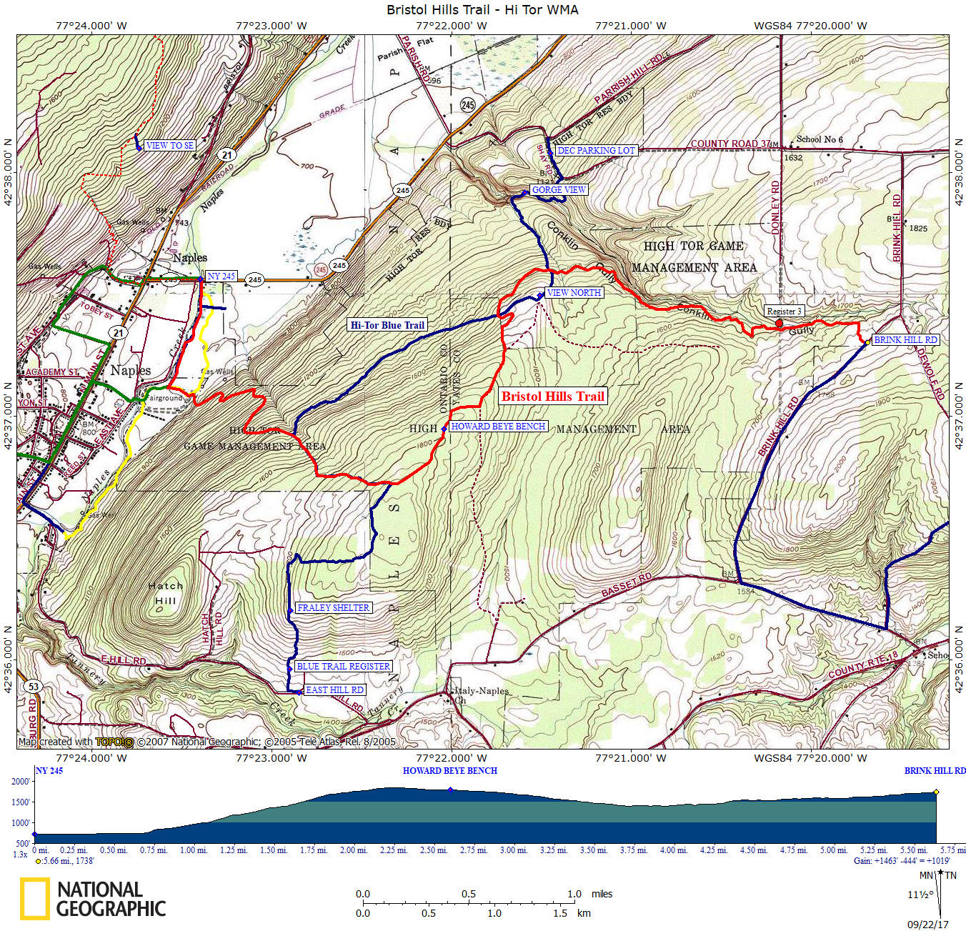 5.65 1738 feet Reach Brink Hill Rd. End of this section. Some shoulder parking. GPS N42 37.301 W77 19.693 For a continuation of the Bristol Hills Trail see Hi Tor WMA to Italy Hill State Forest