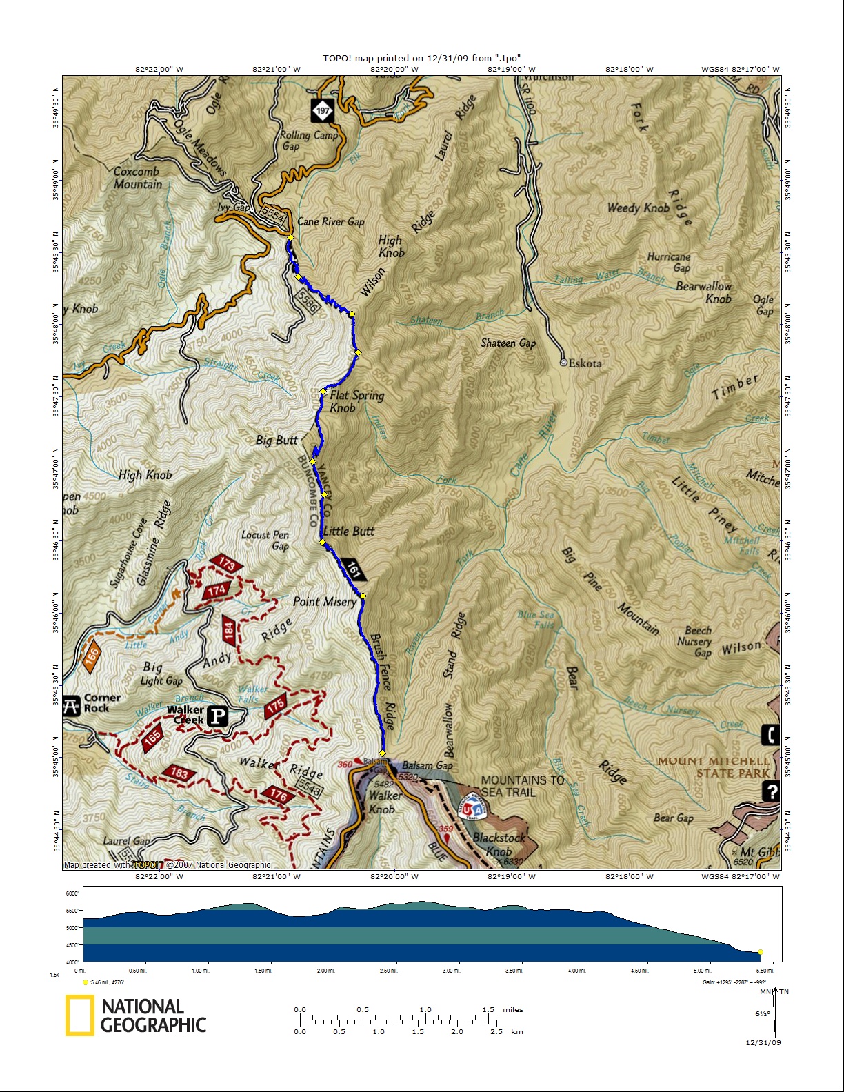 The trail has white blazes. From the southern trailhead on NC 197 at Cane River Gap, the trail begins ascending gently in a southeasterly direction to the southern end of the Wilson Range and begins to switchback during its elevation gain. Eventually the trail levels out to join an old 4WD road which follows the Buncombe/Yancey County line which is blazed in red. After a couple of miles, the trail narrows. The trail climbs to Flat Springs Knob and then descends to Flat Springs Gap. The trail skirts Big Butt Peak, but does go south to Little Butt Peak. the trail then climbs again to Point Misery Peak where one can see a clear sight of Mount Mitchell. The trail then follows Brush Fence Ridge, enters a Fraser fir stand for the last 0.5 mile before the Balsam Gap pull off on the Blue Ridge Parkway. Primitive camping is available near Flat Springs Gap and Balsam Gap.