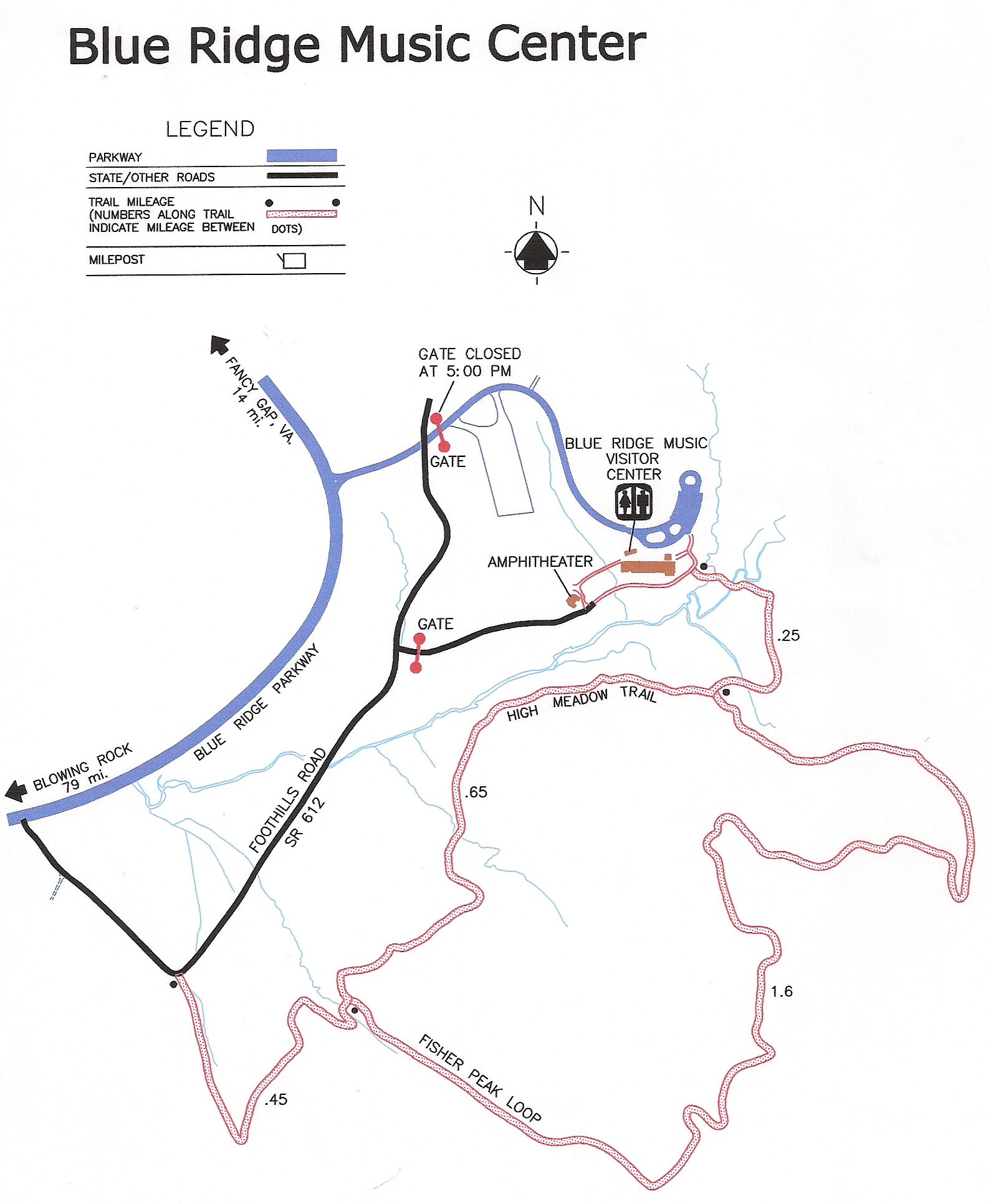 The Blue Ridge Music Center, operated jointly by the National Park Service and The National Council for the Traditional Arts, is located at milepost 213 on the Blue Ridge Parkway near the Virginia-North Carolina state line, six miles south of Galax.  The Visitor Center is open 9-5 daily May through October and during most evening concerts.