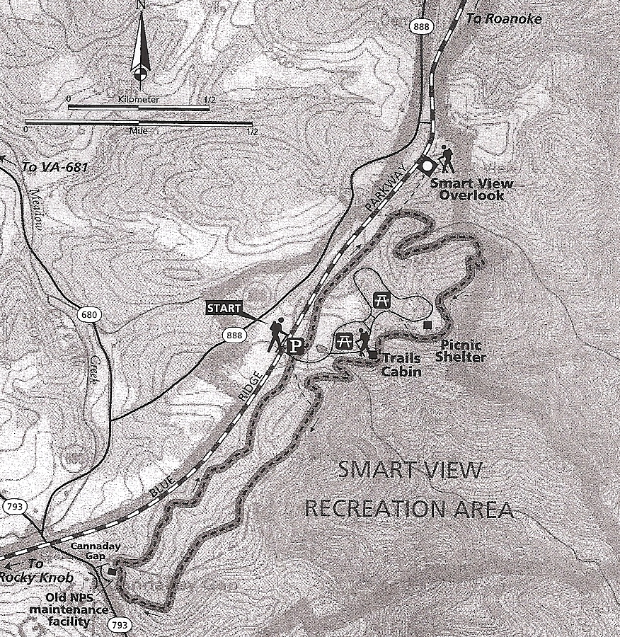 The Smart View Picnic Area is located at milepost 154.5 off the Blue Ridge Parkway. This is not your ordinary leg stretcher picnic area loop hike. The Smart View Loop Trail offers much more as it mixes meadows with a deep stream drainage, a visit to a 1890 cabin and a pleasant walk through scenic forests. The main loop (on map below) is a three mile hike. You can create shorter hikes of 2.1 or 1.6 miles by utilizing a connector trail.