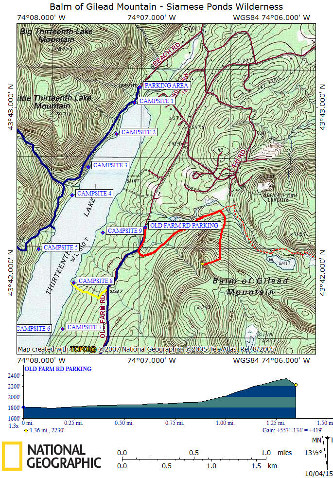 Directions: The trailhead is located off NY 28 just north of North River. Turn onto Thirteenth Lake Road and after 3.3 miles veer left at the junction of Beach Road, staying on Thirteenth Lake Road. In another 0.8 miles veer right onto Old Farm Road. The road will become a seasonal dirt road and follow it till your reach the end of Old Farm Road. There is a large parking area at the end of the drivable road. This parking area is not plowed in the winter. The GPS coordinates of the parking area is N43 42.275 W74 07.055.