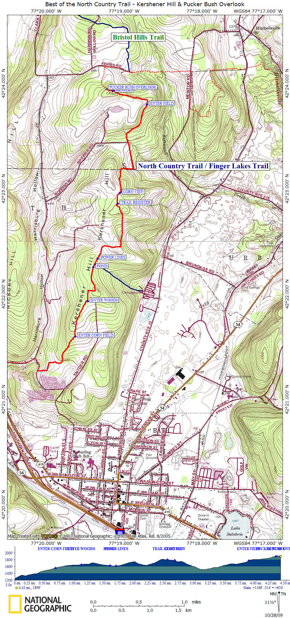This entire hike is located on PRIVATE PROPERTY and there is no camping or fires allowed on this section of the North Country Trail, except at Hickory Hill Lean To (built in 2011). The NCT coincides with Finger Lakes Trail along this section. The elevation profile on the map below is just one way.