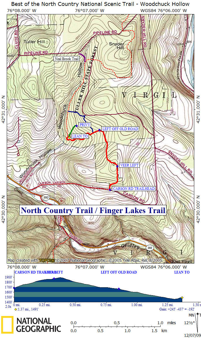 Mile Elevation Description 0.0 1683 feet From Carson Road, the trail enters Tuller Hill State Forest. Follow white blazes. Ascending.