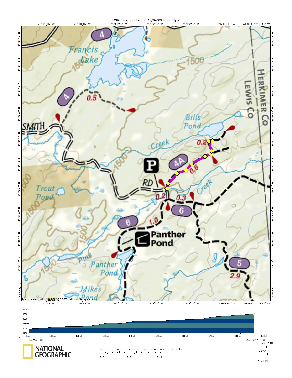 Directions: From Lowville, NY 26 to Number Four Road. Drive 16.2 miles on Number Four Road then turn right onto seasonal dirt Smith Road. There is a DEC trailhead sign at the intersection. Take Smith Road 3.8 miles to its end at the parking area for Panther Pond. At 2.1 miles you'll pass a gate for Trout Lake (private property).