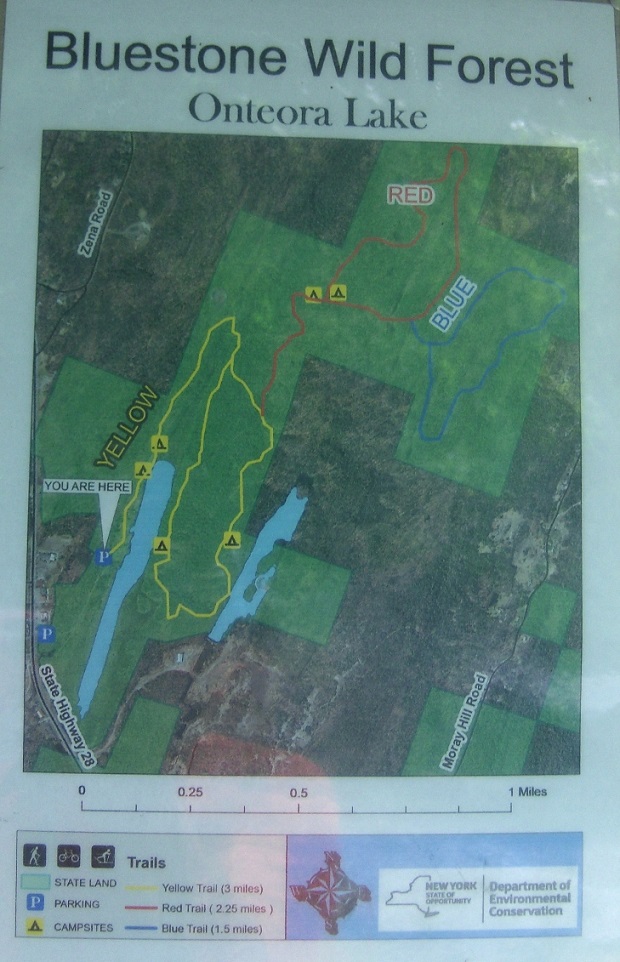 The red loop trail is 2.25 miles long and ascends a ridge with a couple of vernal pools. There are two designated campsites near where the red loop trail splits. The blue loop trail is the toughest of the three loop trails and is about 1.5 miles long. You have the opportunity to pick the loop hike that fits your schedule or do a short backpacking trip. Look below for a few pictures as well as a couple of maps of Bluestone Wild Forest. You can expect to see families fishing, walking and picnicking during the summer.