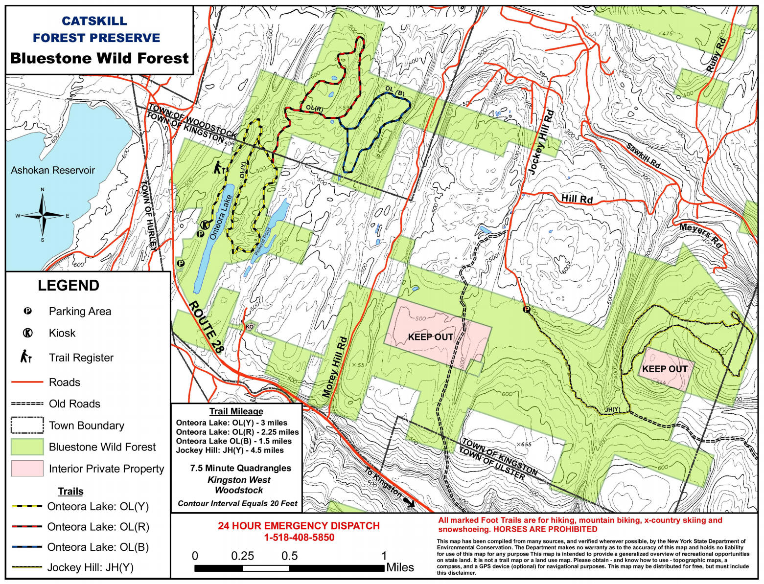 The 3,000 acre Bluestone Wild Forest is one of the most popular destinations in the Catskills. The Blue Stone Wild Forest is located just three miles west of Kingston. The most popular destination is Onteora Lake with a major trailhead located near the lake. An accessible trail begins at the parking area near a kiosk. The trail travels toward an observation point and ends at the shore of the lake where you'll find a fishing platform. There are designated primitive campsites located in this state land.