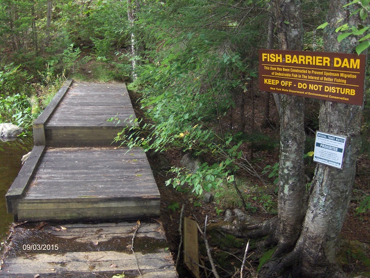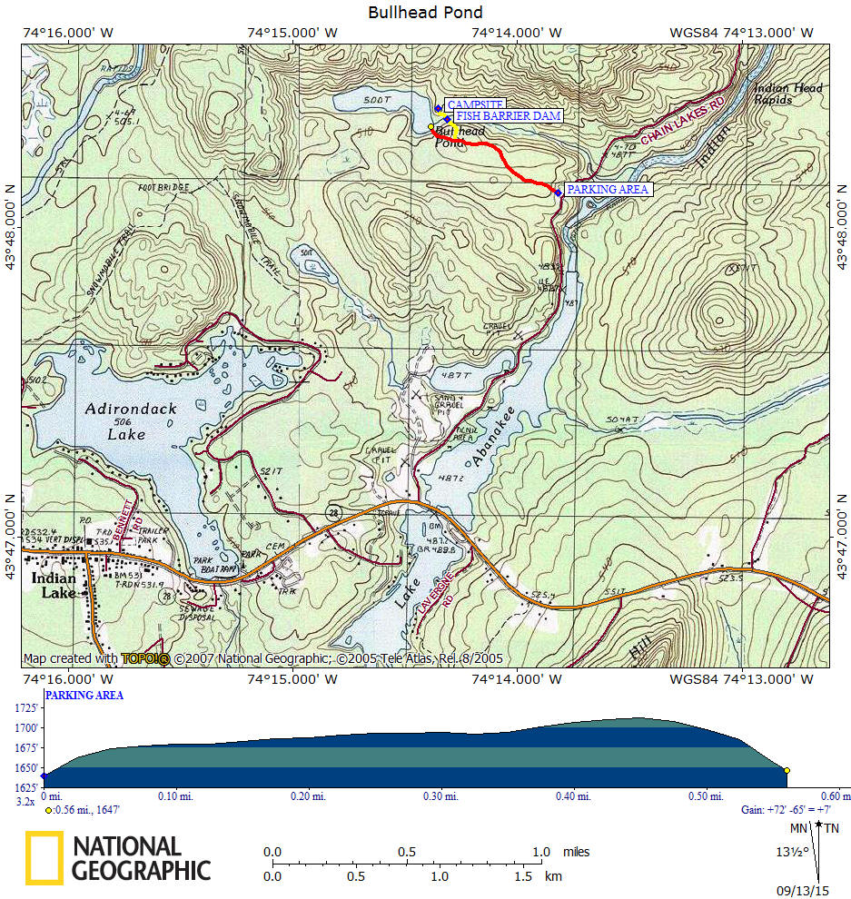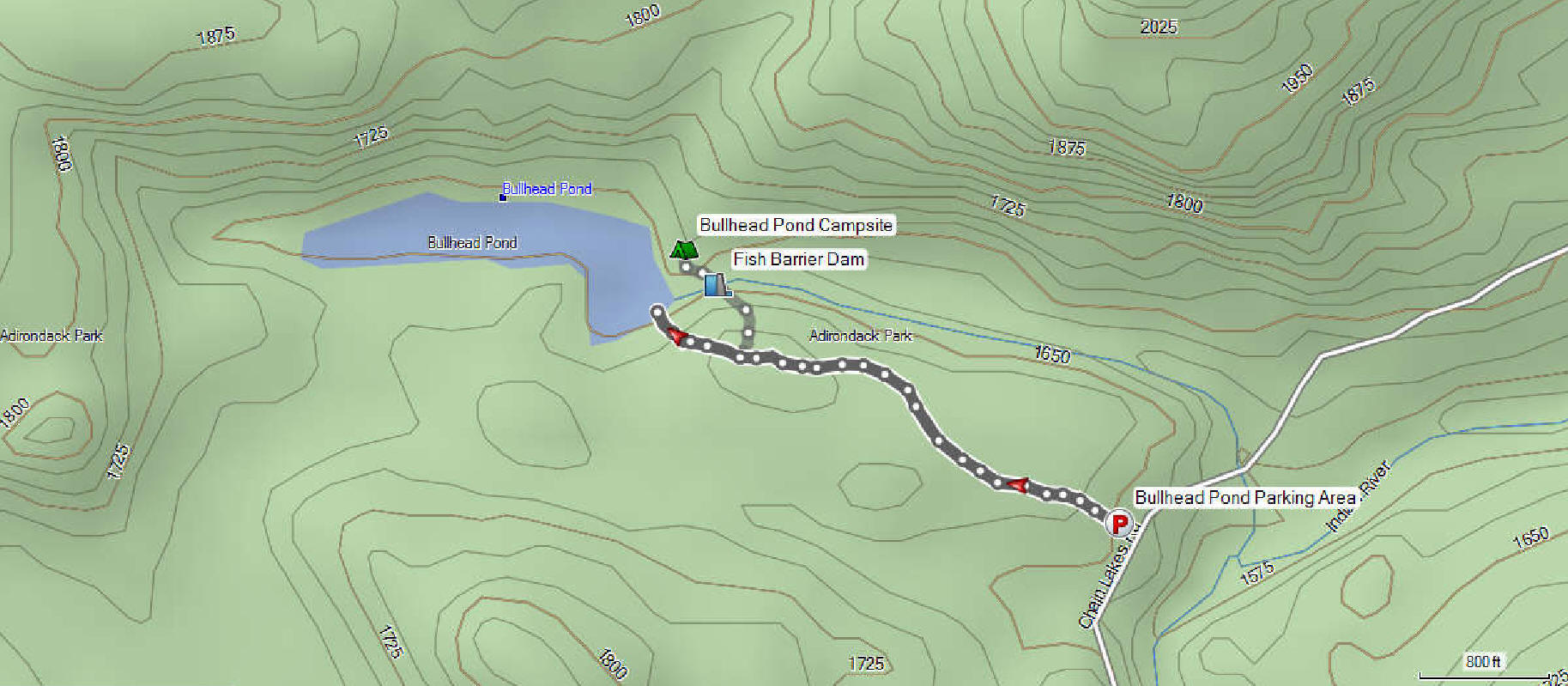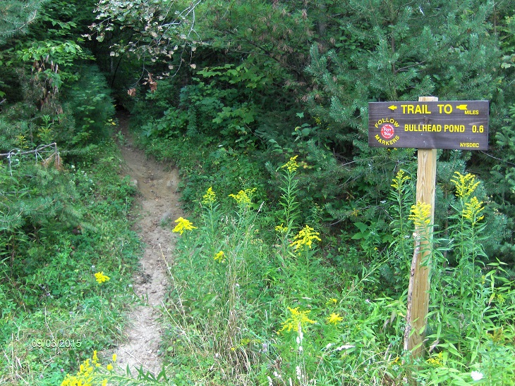 From the large parking area the red marked trail climbs the bank of the parking lot where the DEC sign is for Bullhead Pond and follows an old woods road. There is no trail register. Near the start of the trail, off to the right you may notice an old stone foundation. At 0.45 miles there is a somewhat hidden junction of a yellow marked trail that travels to the fish barrier dam and then on to a campsite above the pond. The main trail descends, veers right and reaches the south shore of the pond at 0.6 miles.