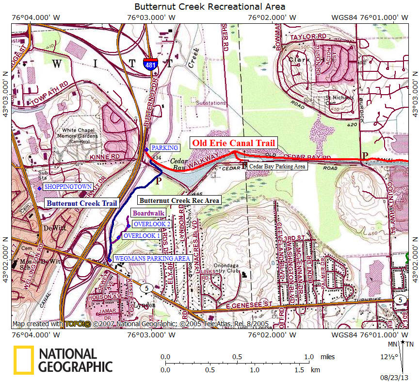 Directions: A parking area is located on Kinne Street in Dewitt, just east of the I-481 overpass about 0.2 miles from the three way stop at the corner of Butternut Drive. The GPS coordinates are N43 02.507 W76 02.954 for those who have a GPS devise. You may also park in the Wegmans parking area near where the trail reaches the parking area (no signs 8/2013). The GPS coordinates are N43 01.995 W76 03.342.