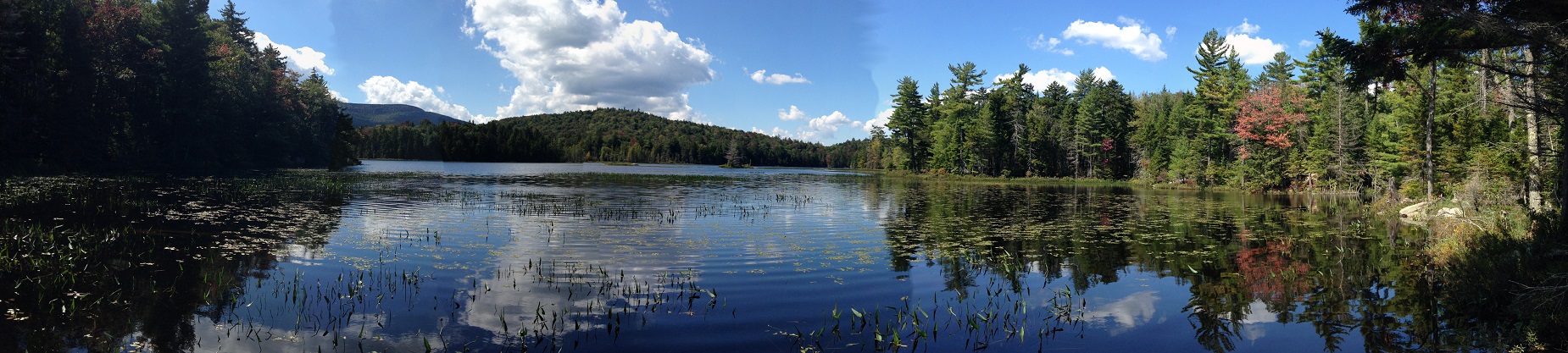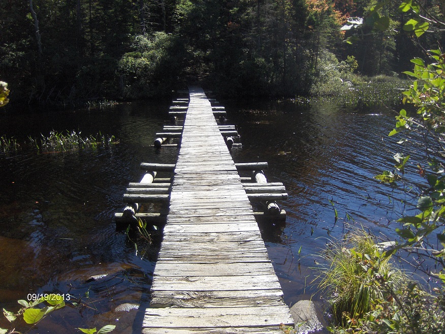From the Durant Road trailhead: You are following red markers and almost immediately pass a trail register. At 0.6 miles cross Rock Pond on a floating bridge. The trail climbs a ridge after the bridge, then descends into a small valley, crossing a small stream. The trail climbs again after crossing the stream, sometimes steeply as you climb to a height of the land. At 2.1 miles the main red marked Cascade Pond turns left on an old road.
