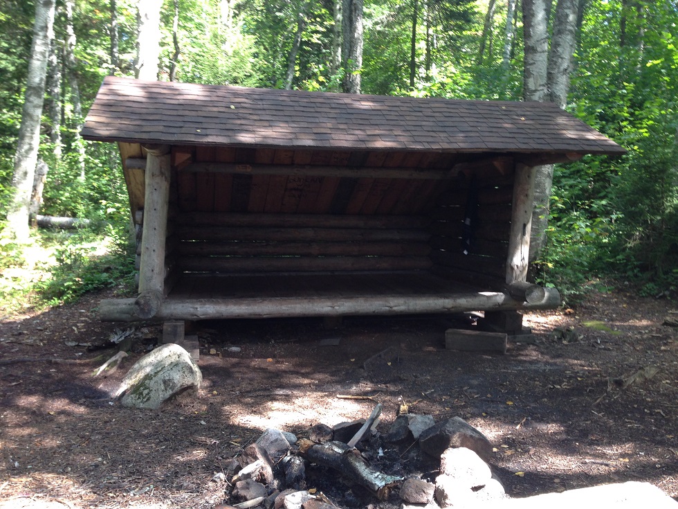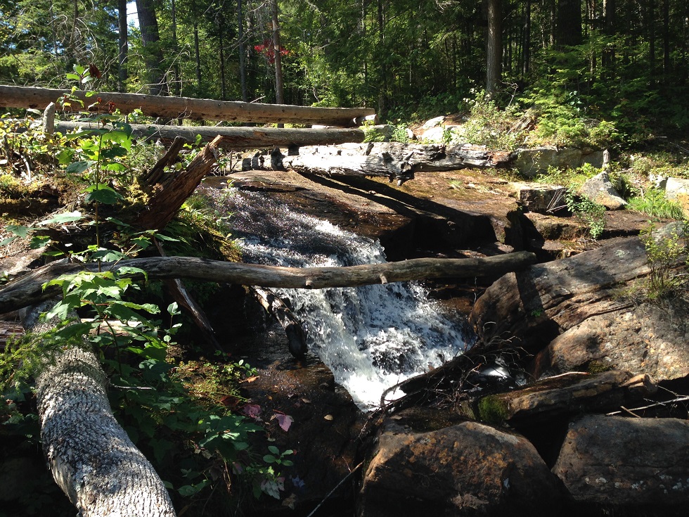This old road travels toward Grassy Pond on the right. At 2.6 miles the trail passes the site of where the old lean to was situated. Soon reach the log bridge that crosses the outlet of Cascade Pond. There is a small waterfall located at the outlet. The trail can get confusing here. The trail works away from the pond. At 2.7 miles reach a side trail on the right that leads to the new lean to site.