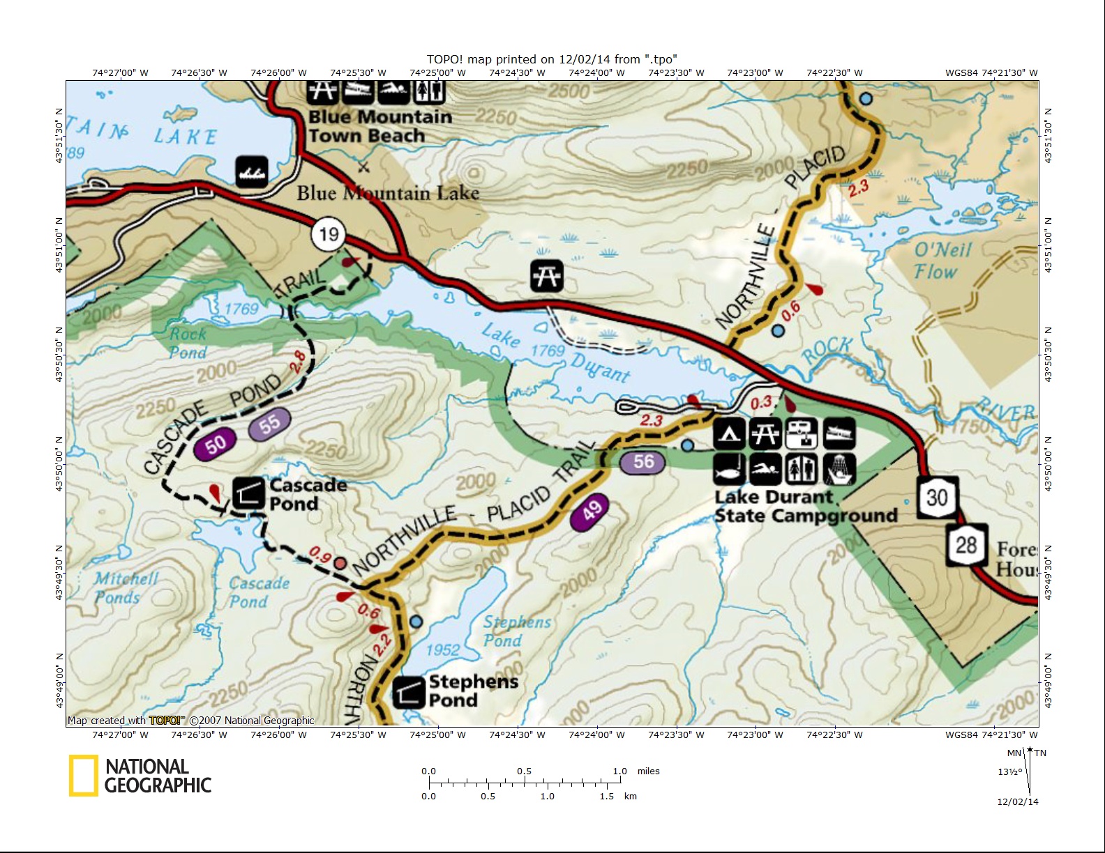 The two other starting points involve the overly popular Northville-Placid Trail and Lake Durant State Campground. One starting point is outside of the campground along NY 28/NY 30 and the other is within the campground (fee required unless camping at campground). It is a four mile hike to Cascade Pond from the NY 28/NY 30 trailhead and 3.5 miles from the campground trailhead. Look below for info on each of the possible hikes from the different starting points.
