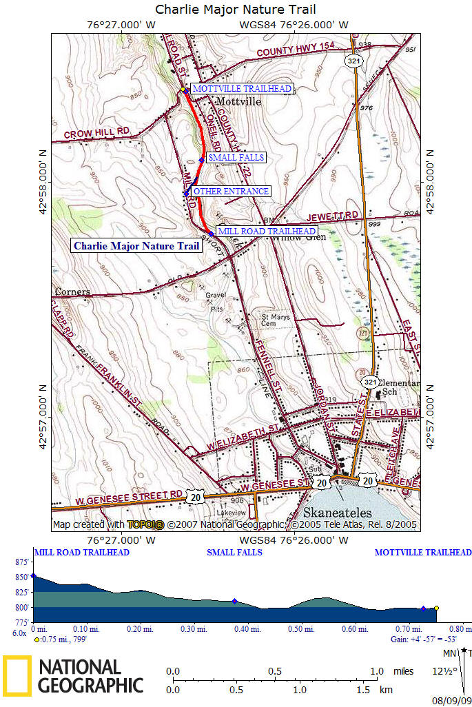Today, the rails are gone and a serene path follows Skaneateles Creek for part of its journey. There is a nice area to picnic along the creek at the north end near the Crow Hill Road bridge (the Mottville Trailhead). There is also a nice playground at the Mottville Trailhead for the kids to enjoy. This 0.8 mile pathway, known as the Charlie Major Nature Trail, still has the relics from a time long gone as you walk or ride this path. Look closely and you'll see remnants from the days of the railroad. Look below for a trail map from our hike, plus a few pictures and a video of part of the Charlie Major Nature Trail. This hike is one of many featured in the book "Take Your Bike - Family Rides in New York's Finger Lakes Region