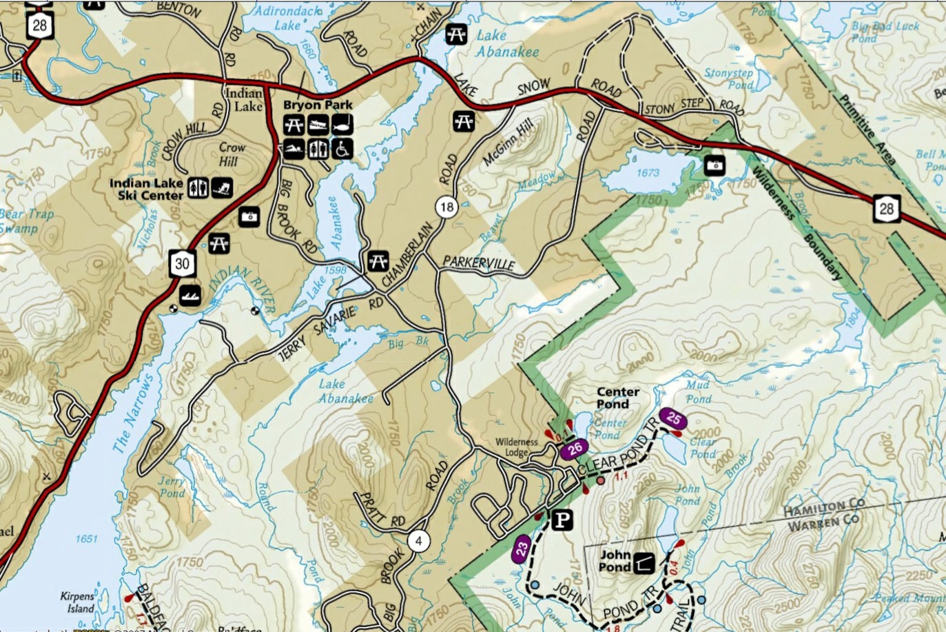 Directions: From the hamlet of Indian Lake, take NY 30 south. Turn left on County Route 4 aka Big Brook Road. Turn left on Starbuck Road. Starbuck Road turns into Lakeview Road. At the end of the road, reach Wilderness Lane. The trail starts across from this junction. There is some parking along the shoulder of the road. The GPS coordinates are N43 44.096 W74 13.088 for those who have a GPS devise. If you turn right and follow Wilderness Lane to the end of the road, there is a large parking area as well as the start of the John Pond Trail.