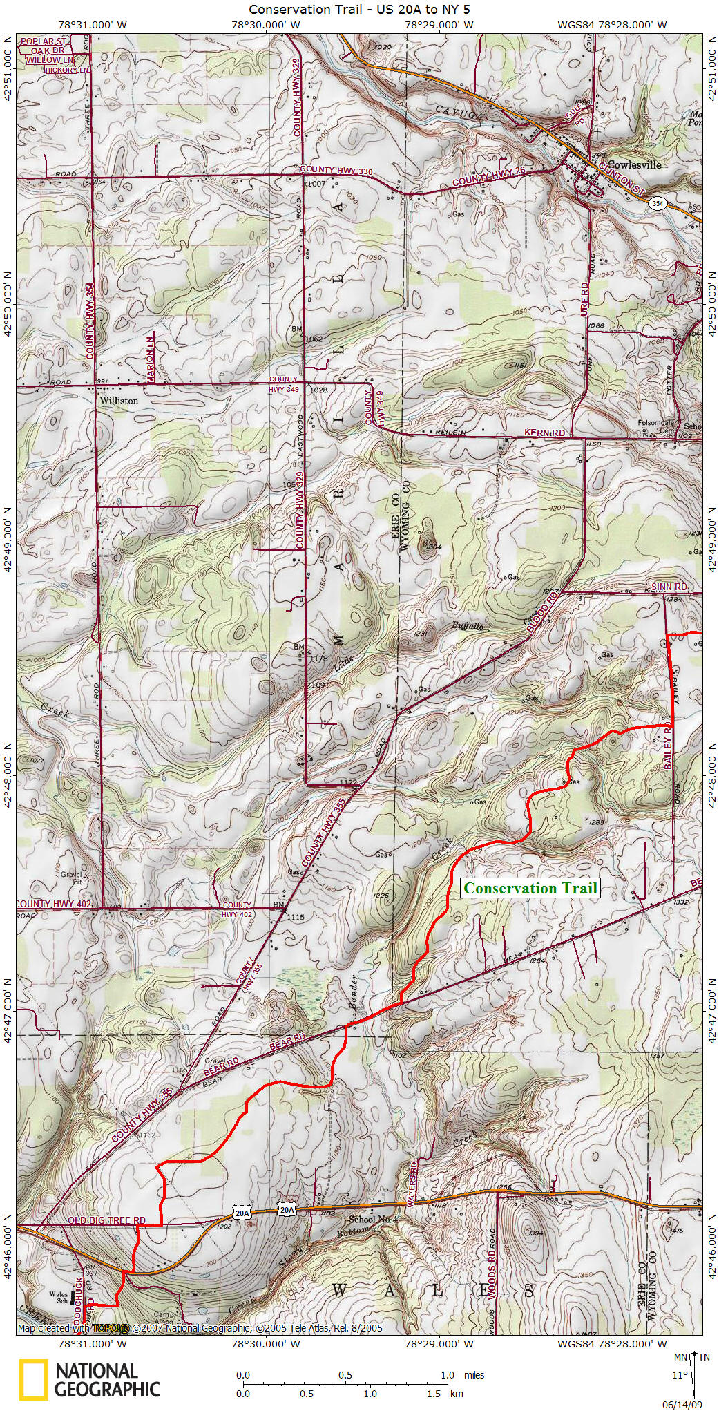 This section of the Conservation Trail begins off US 20A at Camp Aloha. The trail follows US 20A east for 250 feet before turning left off the road and into the woods. The trail briefly follows old US 20A before going back off road along the edge of a field. This next two mile section of trail up to Bear Road is CLOSED for HUNTING from Nov 1 to Dec 22.